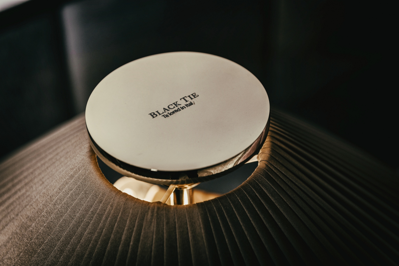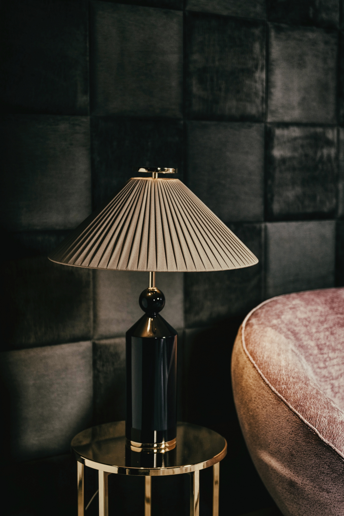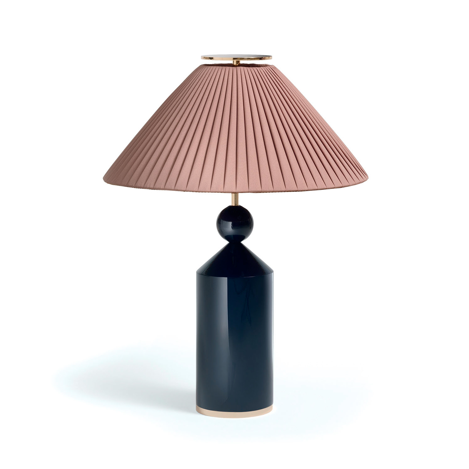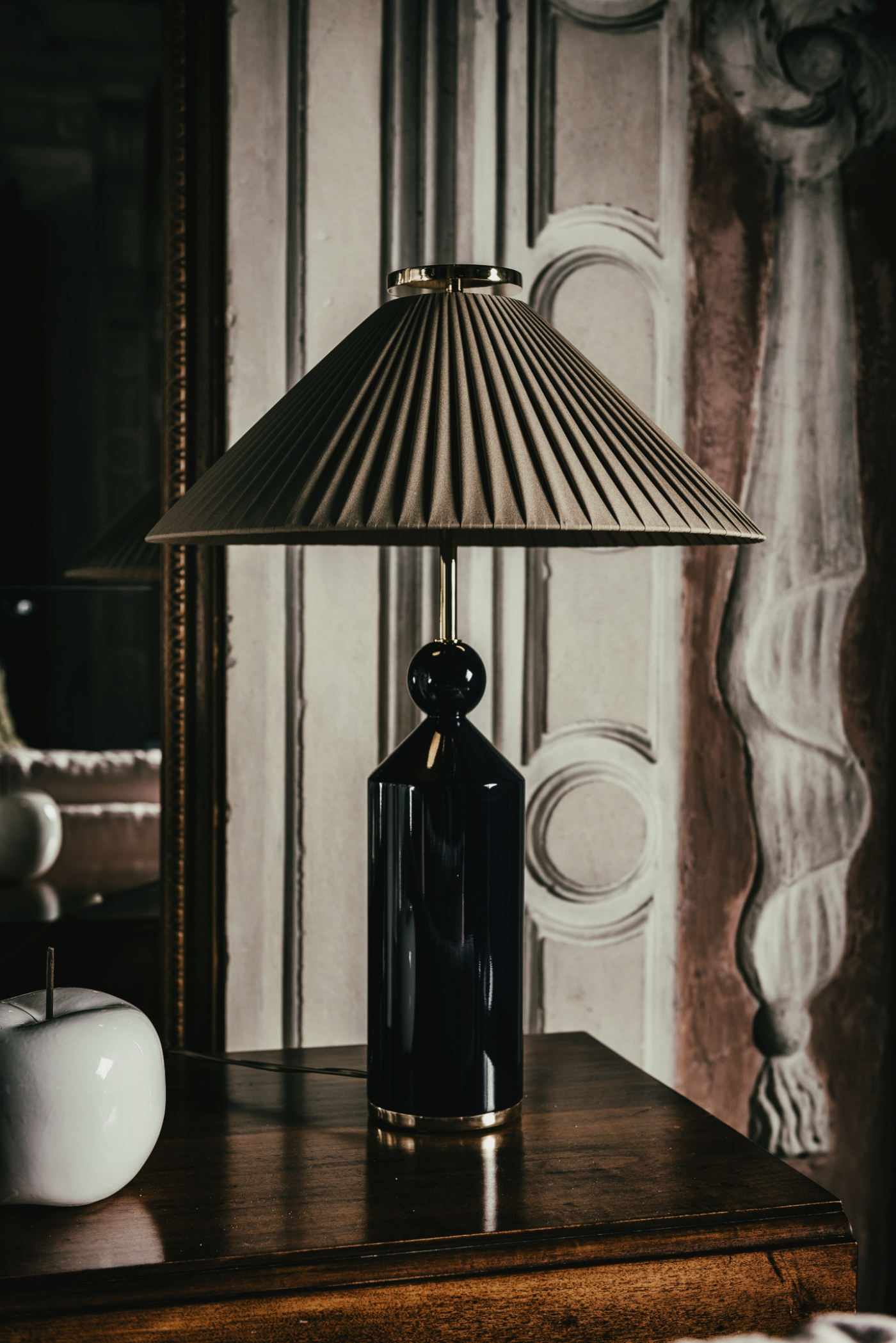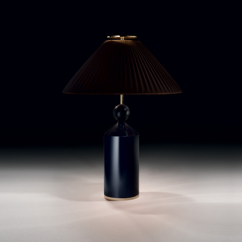 Настольная лампа Nadine с основанием из дерева в глянцевом темно-синем цвете. Абажур из плиссированной ткани коричневого цвета, металлические части золотого цвета.