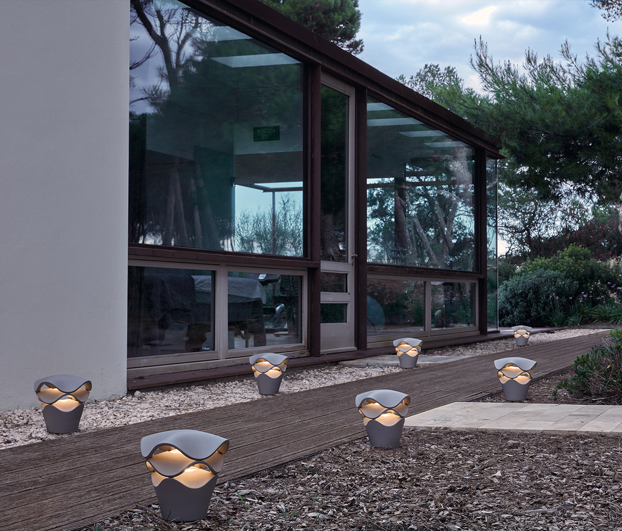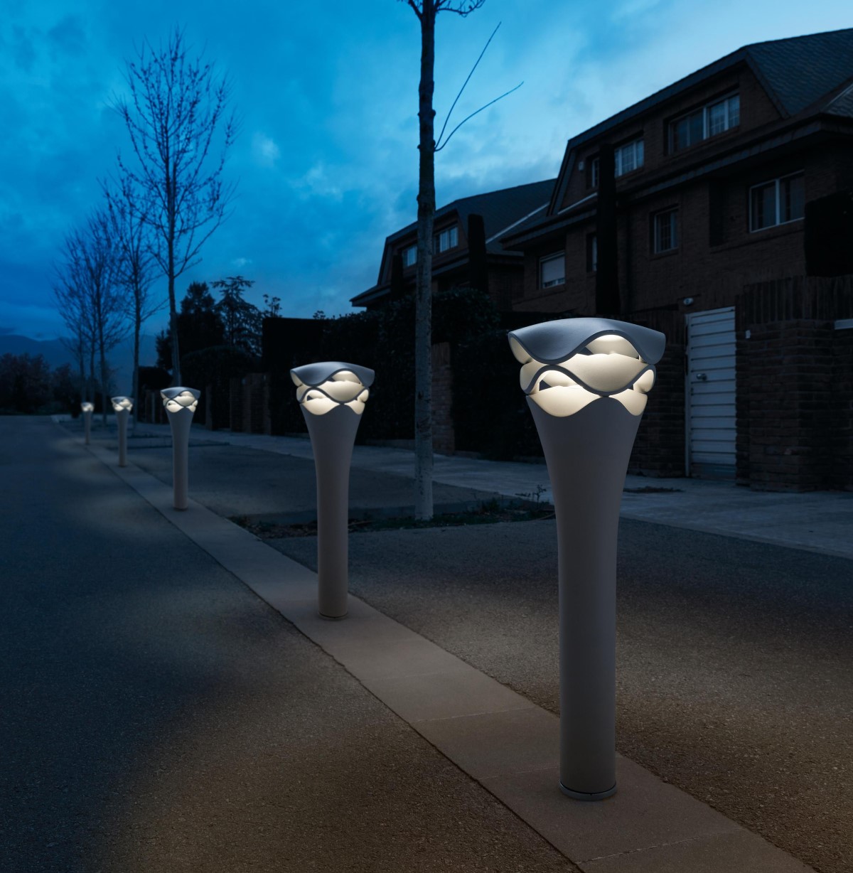Уличный светильник Bover из коллекции Cornet из полиуретана, твердого и прочного материала, который идеально подходит для общественных мест, он очень универсален. Cornet включает светодиодный источник с регулируемой яркостью, который распределяет свет через волнообразные слои лампы, создавая естественную, слегка нарушенную, но никогда не доминирующую атмосферу.