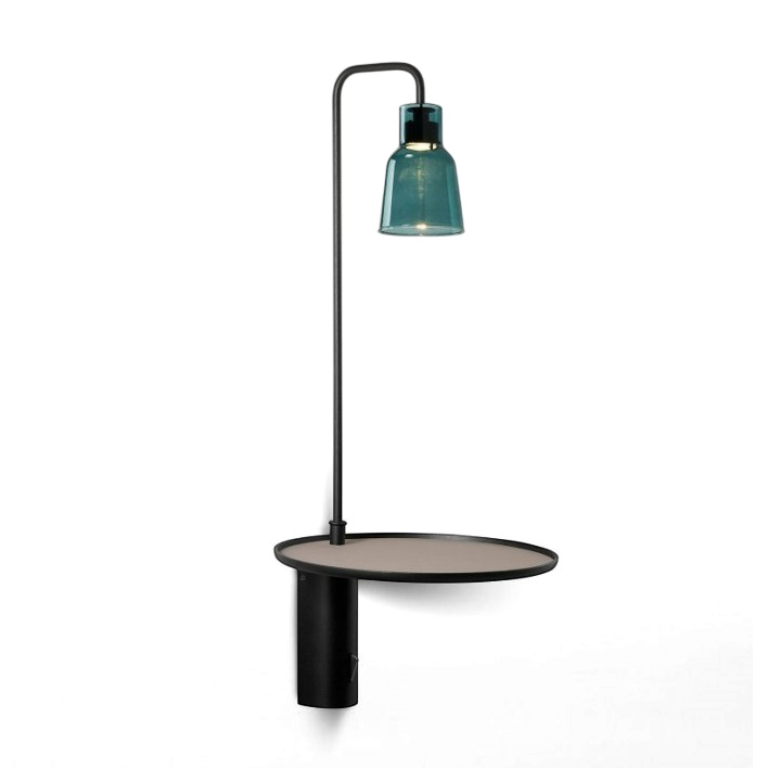 Настенный светильник Bover из коллекции Drip-Drop. Основание из металла черного цвета, плафон из стекла прозрачного голубого цвета. Cветильник с небольшой круглой полочкой и с usb-входом для зарядки гаджетов.