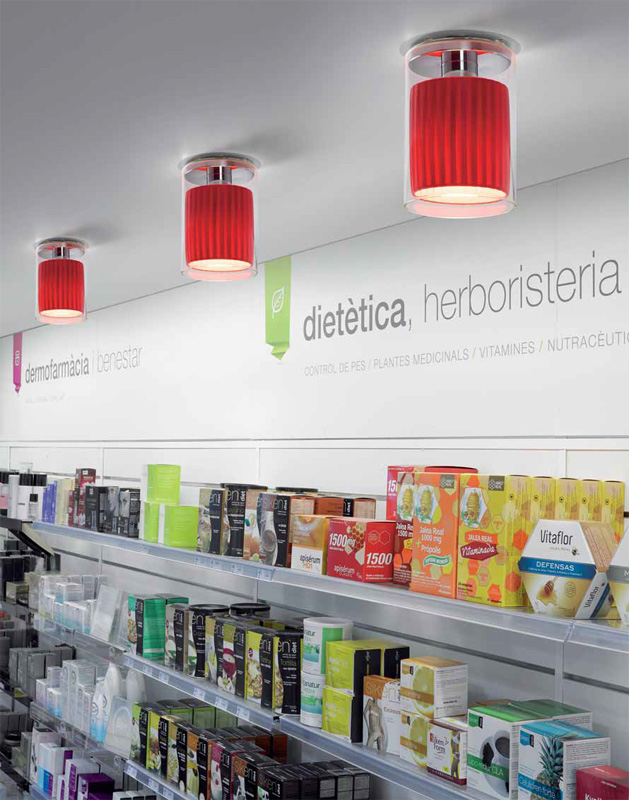 Потолочный светильник из коллекции OLIVER на арматуре из хромированного металла. Плафон выполнен из прозрачного стекла. Внутри текстильный абажур красного цвета. Дизайн: SERGI DEVESA / OSCAR DEVESA 2013