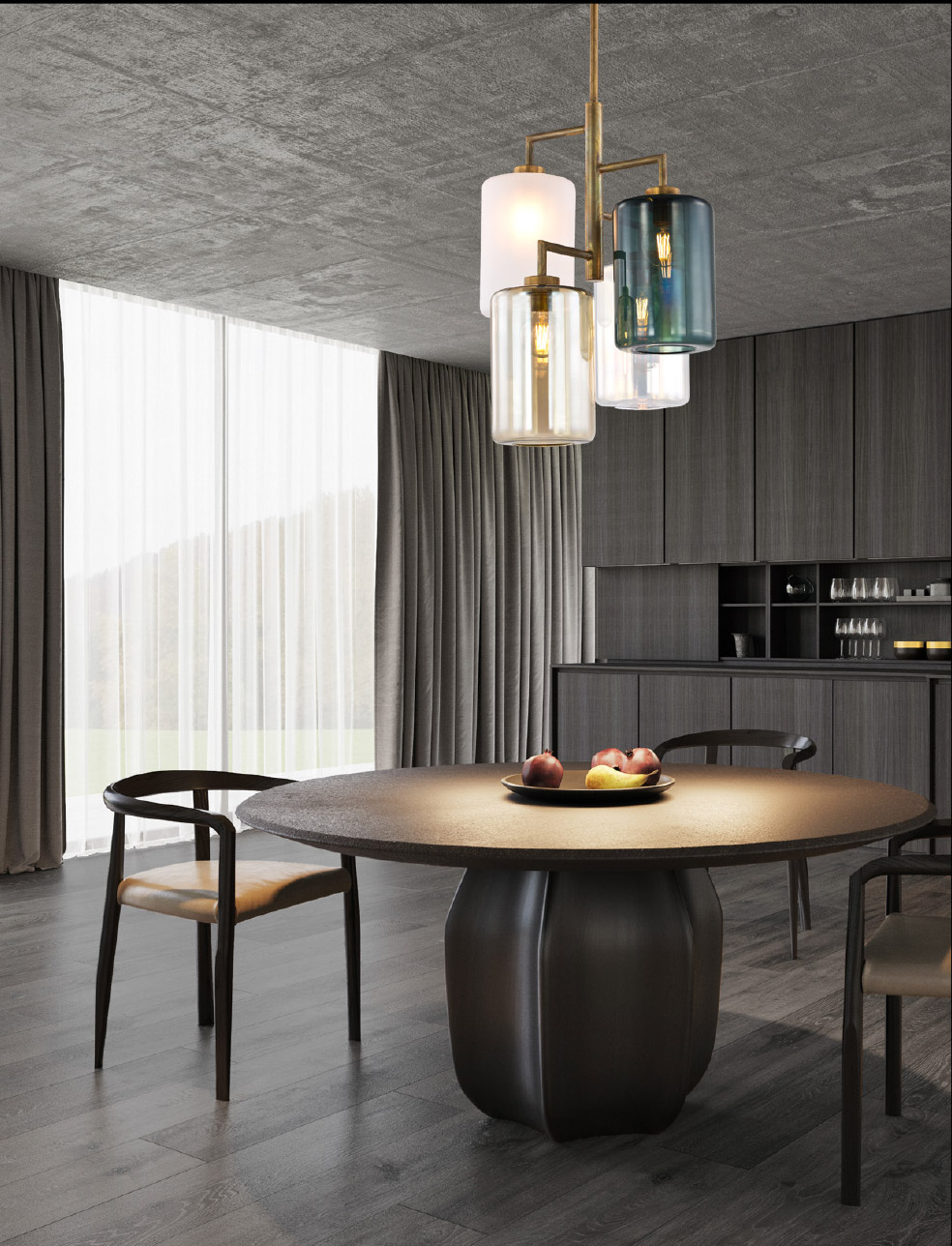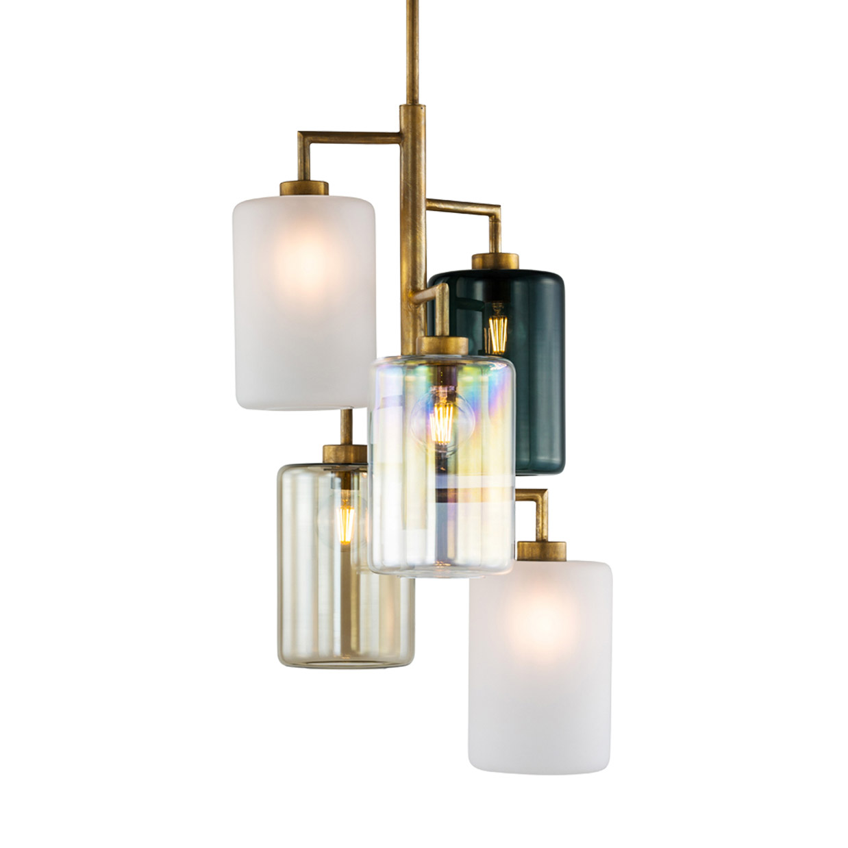Люстра Brand van Egmond Louise 5. Простые линии основания и динамичный ритм стеклянных плафонов, в коллекции Louise присутствует и намек на хаос, как и во всех творениях Вильяма Бранда. Под заказ доступны 6 цветов основания: матовый черный, никель, латунь, полированная латунь, состаренный никель и полированная медь. А также 4 варианта стекла: бронза, полу-матовое, дымчато-серое и прозрачное с радужными переливами.