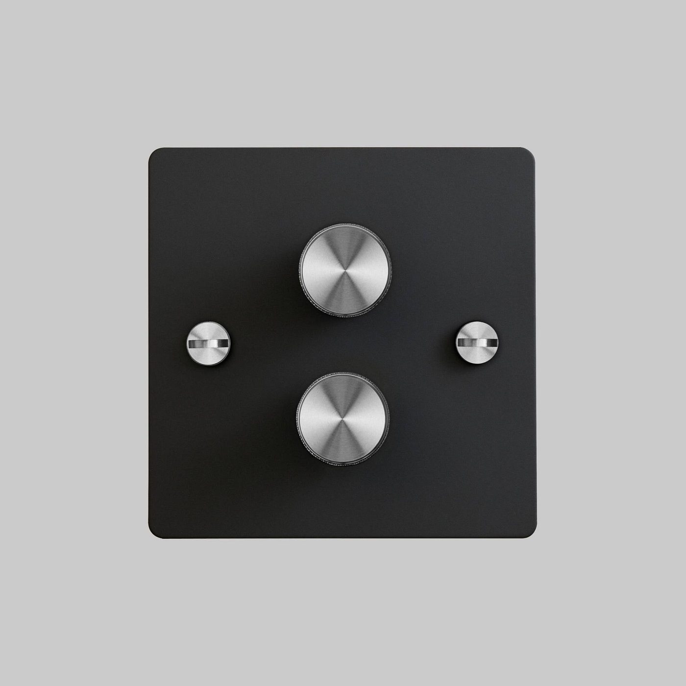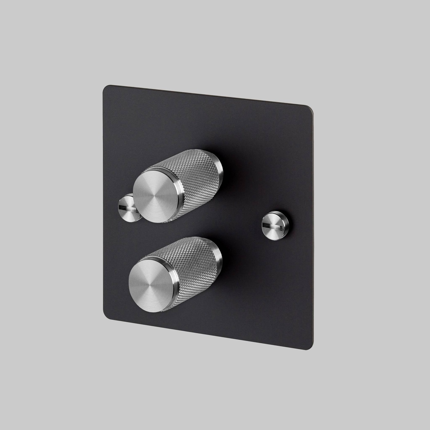 Диммер двойной, черного цвета, детали стального цвета с фирменной крестообразной накаткой. Характеристики: LED 120w/2-way (проходной). Рекомендуется специальная монтажная коробка глубиной 47мм (пластиковая, металлическая), поставляется отдельно.