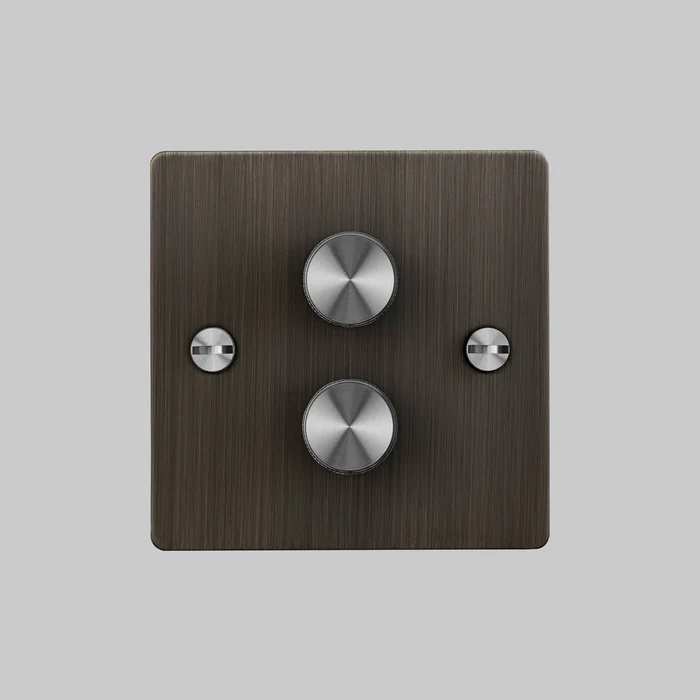 Диммер двойной, дымчато-бронзового цвета, детали стального цвета с фирменной крестообразной накаткой. Характеристики: LED 120w/2-way (проходной). Рекомендуется специальная монтажная коробка глубиной 47мм (пластиковая, металлическая), поставляется отдельно.