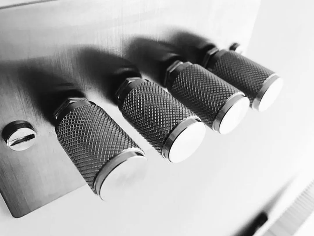 Диммер четверной, стального цвета и деталями латунного цвета с фирменной крестообразной накаткой. Характеристики: LED 120w/2-way (проходной). Рекомендуется специальная монтажная коробка глубиной 47мм (пластиковая, металлическая), поставляется отдельно.