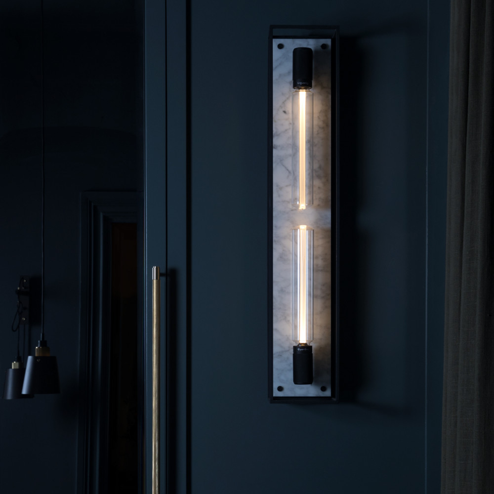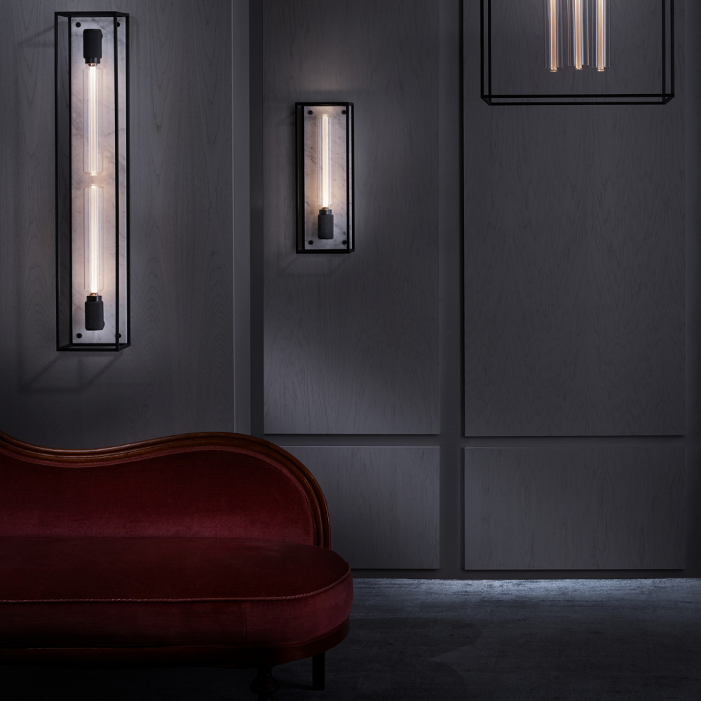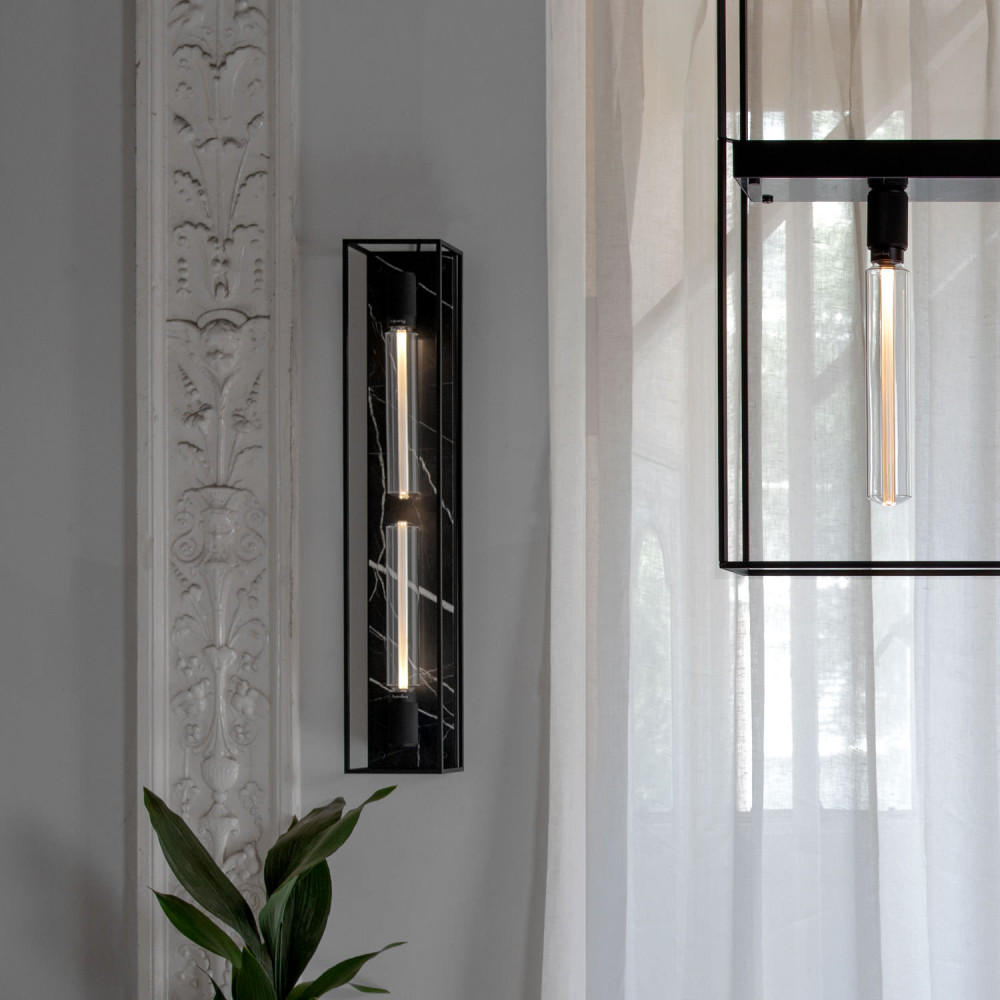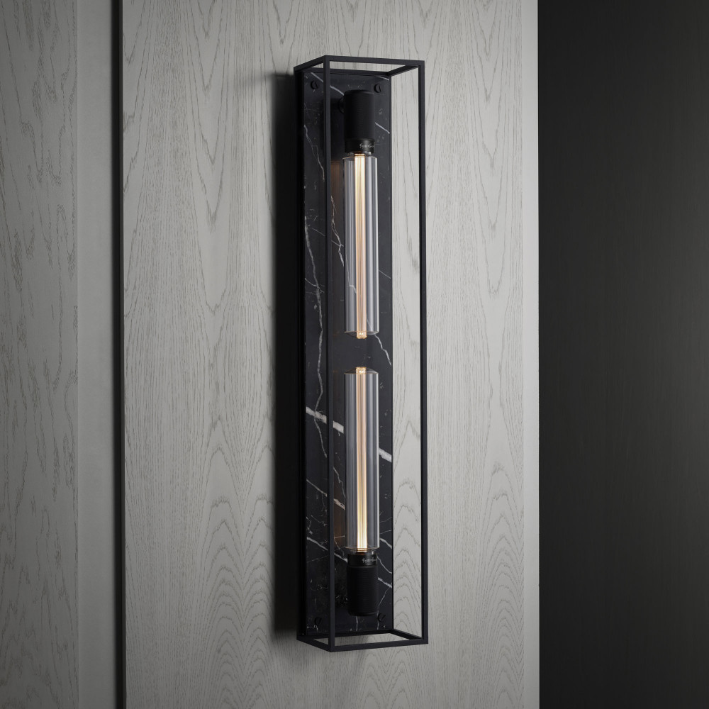 Настенный светильник Caged изготовлен из матового черного металлического каркаса и задней панели из черного мрамора. Этот светильник может работать как самостоятельно, так и линейно, чтобы добиться максимального эффекта. Кабель и лампочка не входят в комплект, продаются отдельно.