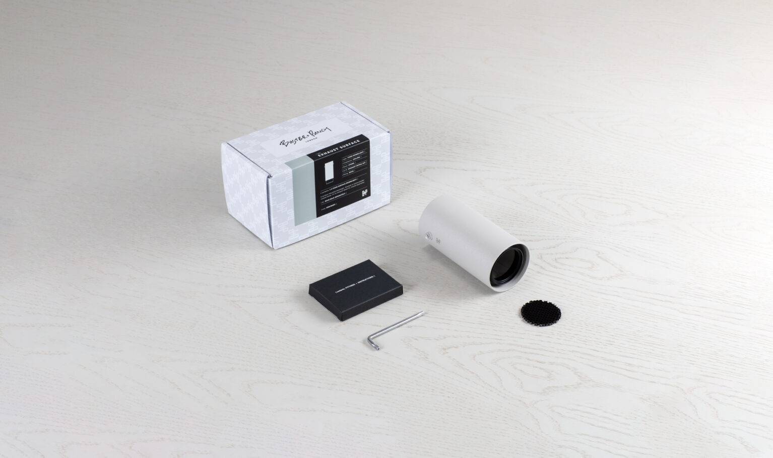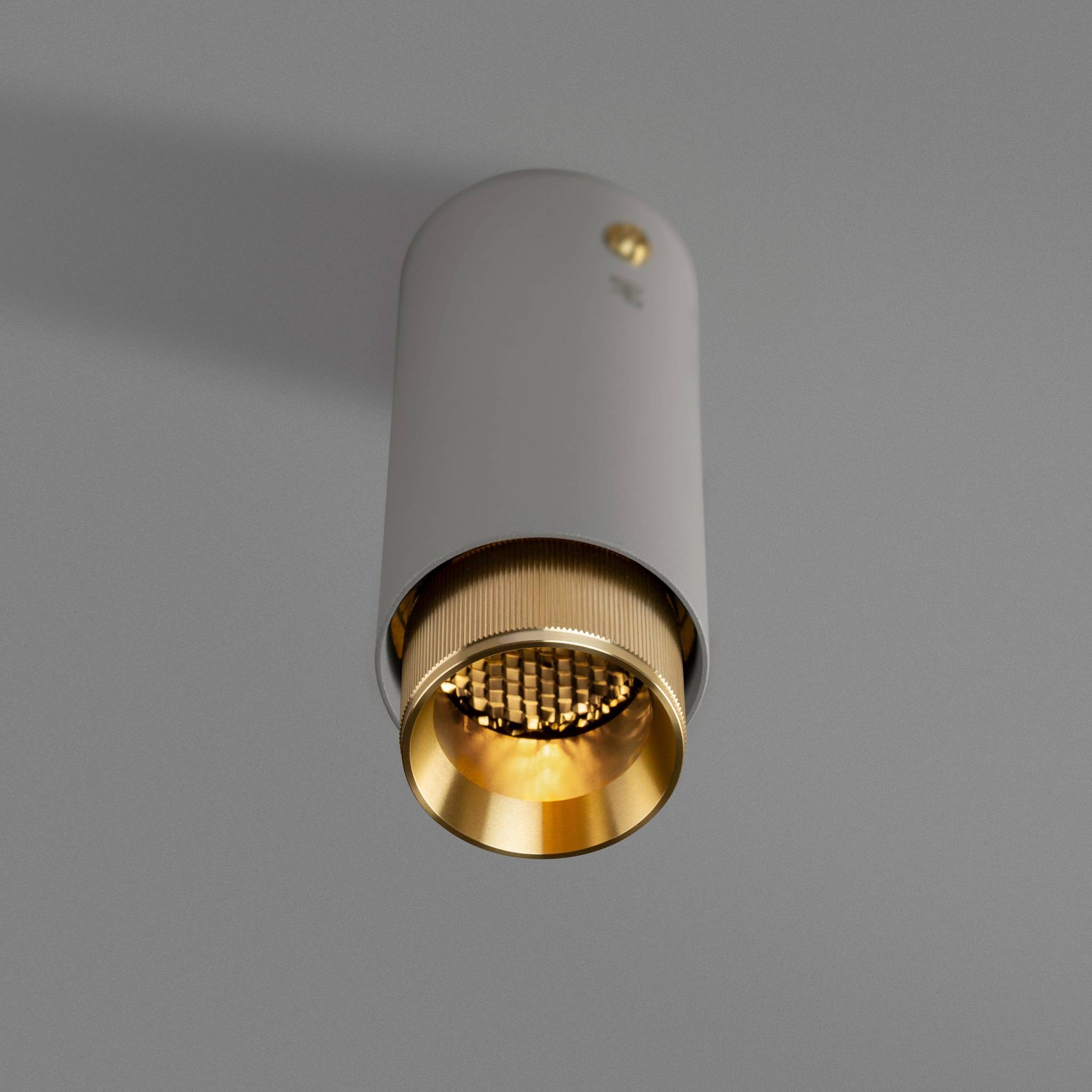 Потолочный светильник Exhaust, изготовленный из металла с порошковым покрытием светло-серого цвета, с цельной металлической отделкой. В центре внимания находятся фирменный дефлектор с линейной накаткой латунного цвета и механические винты Torx. Перегородка улавливает свет и создает тонкий металлический блеск, в то время как сотовый фильтр излучает точный, без бликов, направленный свет.