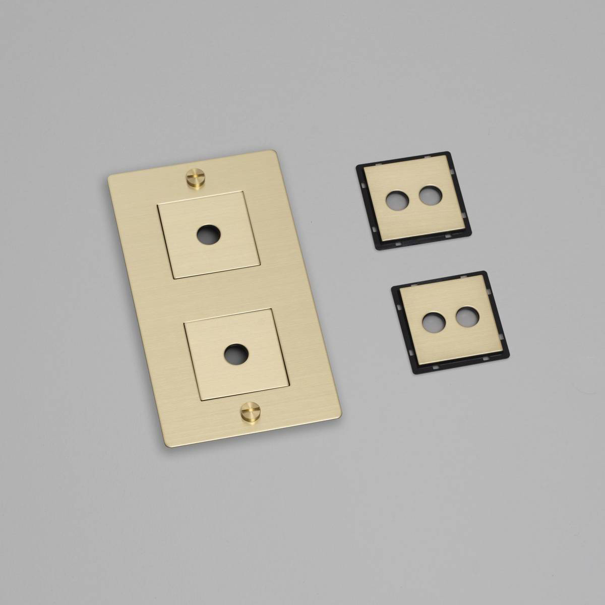 Рамка из металла латунного цвета, вертикальная. Комплектуется различными модулями (выключатели, диммеры, розетки и тд), входящими в коллекцию Plates and Modules.