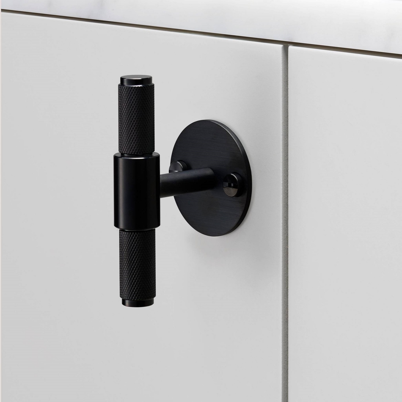 Т-образная ручка Buster+Punch T-Bar Plate Cross Black из металла черного цвета c круглой задней панелью: ручки с узнаваемой фирменной крестообразной накаткой, обработаны вручную. Круто смотрятся на дверцах шкафов, буфетах, кухонных гарнитурах и практически на всем, что вообще может открываться.