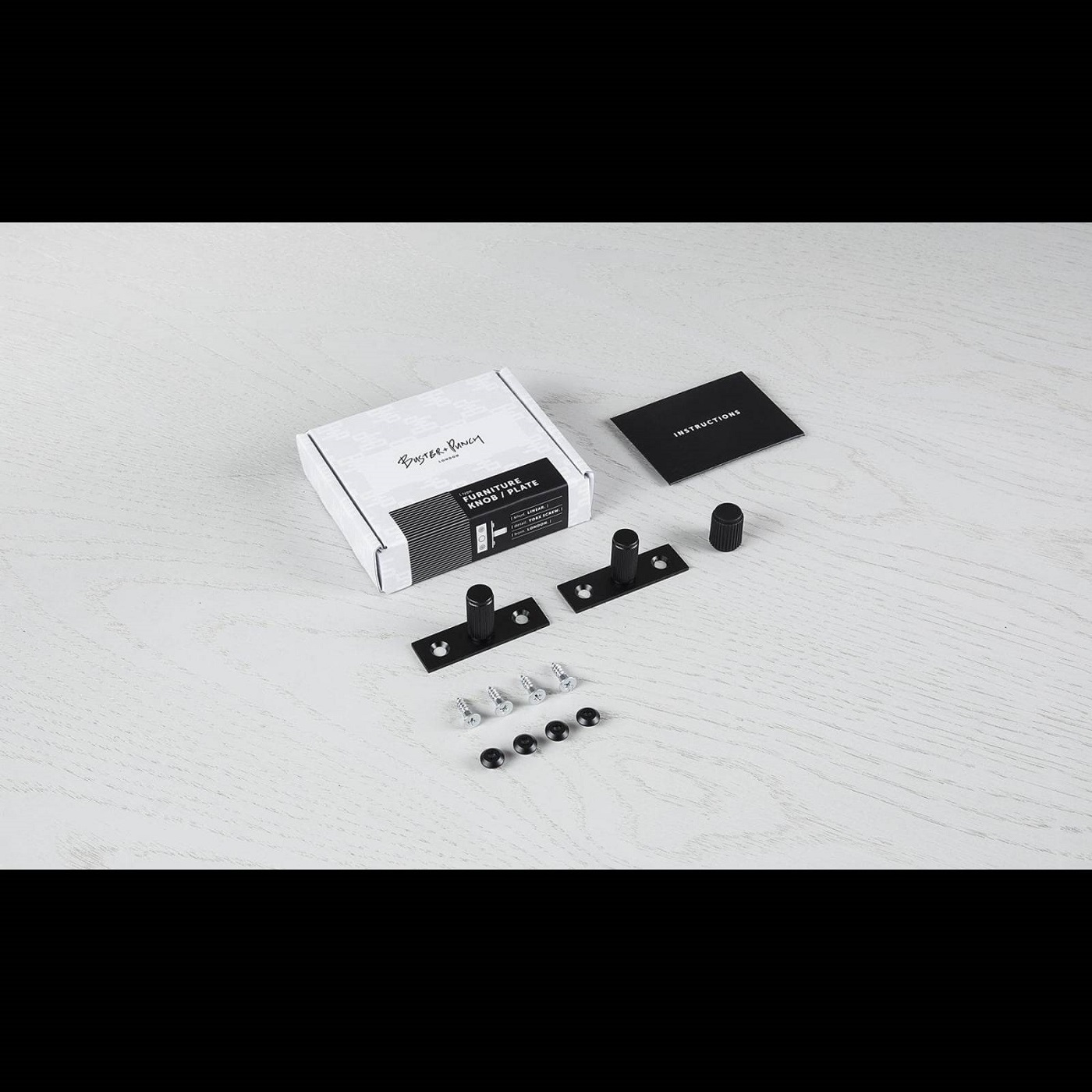 Пара мебельных ручек Buster and Punch Knob Plate Linear Black изготовленных из цельного черного металла, с фирменной линейной накаткой. Ручка для мебели включает в себя прямоугольную заднюю панель.