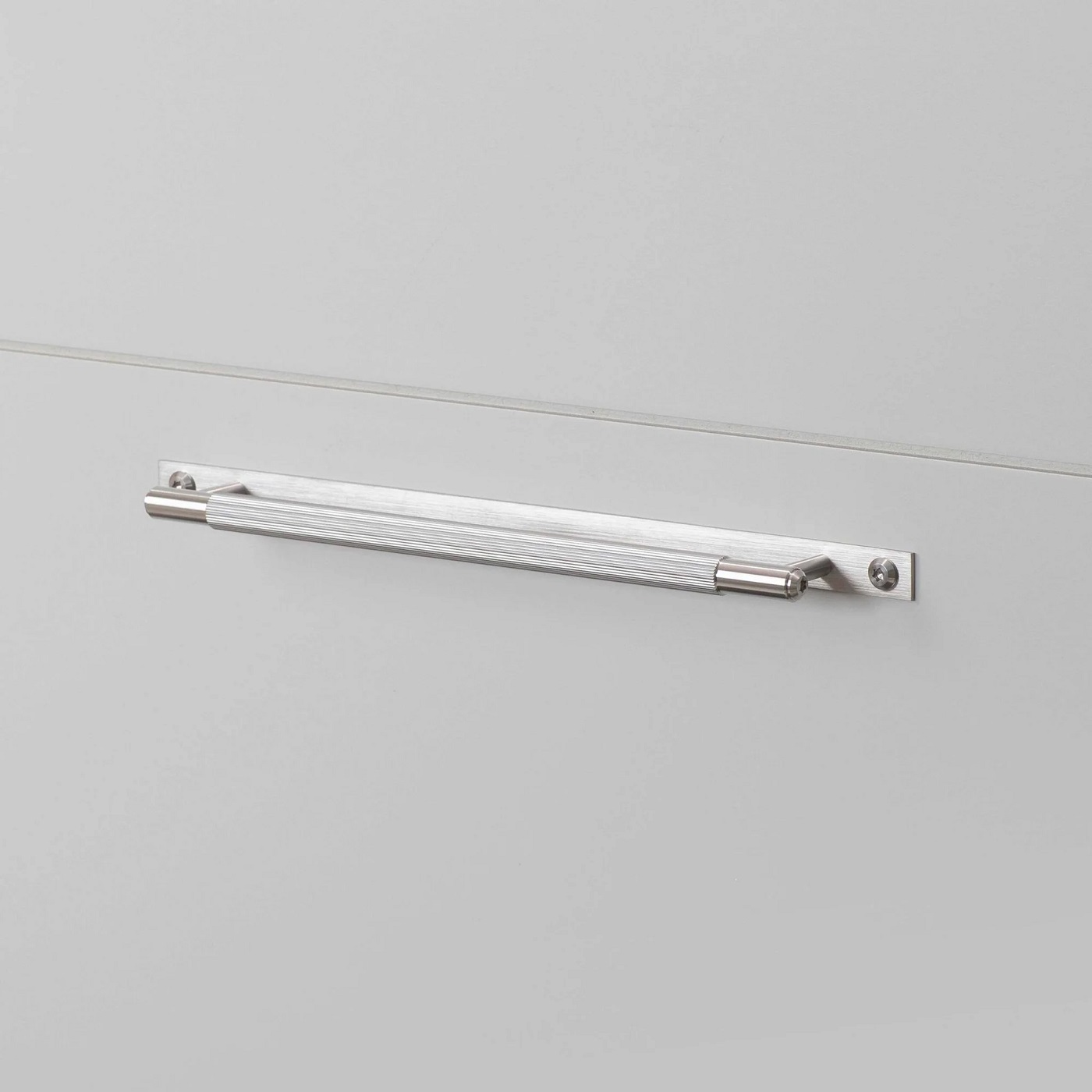 Ручка Pull Bar Plate Linear Medium Steel из металла с фирменной линейной накаткой, обработана вручную. Комплектация включает в себя прямоугольную заднюю панель, изготовленную из цельного анодированного металла.