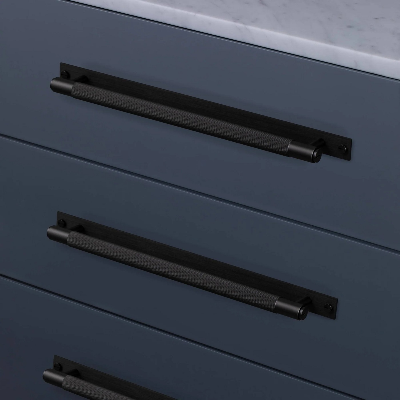 Ручка Pull BAR Plate Black из латуни с фирменной крестообразной нарезкой с ромбовидным узором, обработана вручную. Комплектация включает в себя прямоугольную заднюю панель, изготовленную из цельного анодированного металла.