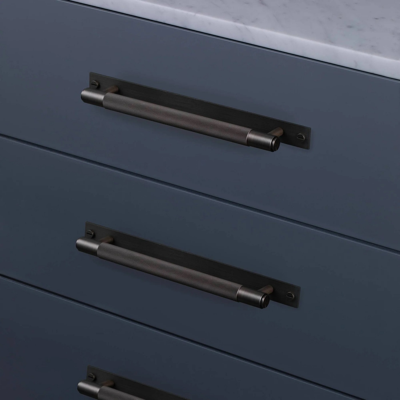 Ручка Pull BAR Plate из латуни темно-бронзового цвета с фирменной крестообразной нарезкой с ромбовидным узором, обработана вручную. Комплектация включает в себя прямоугольную заднюю панель, изготовленную из цельного анодированного металла.