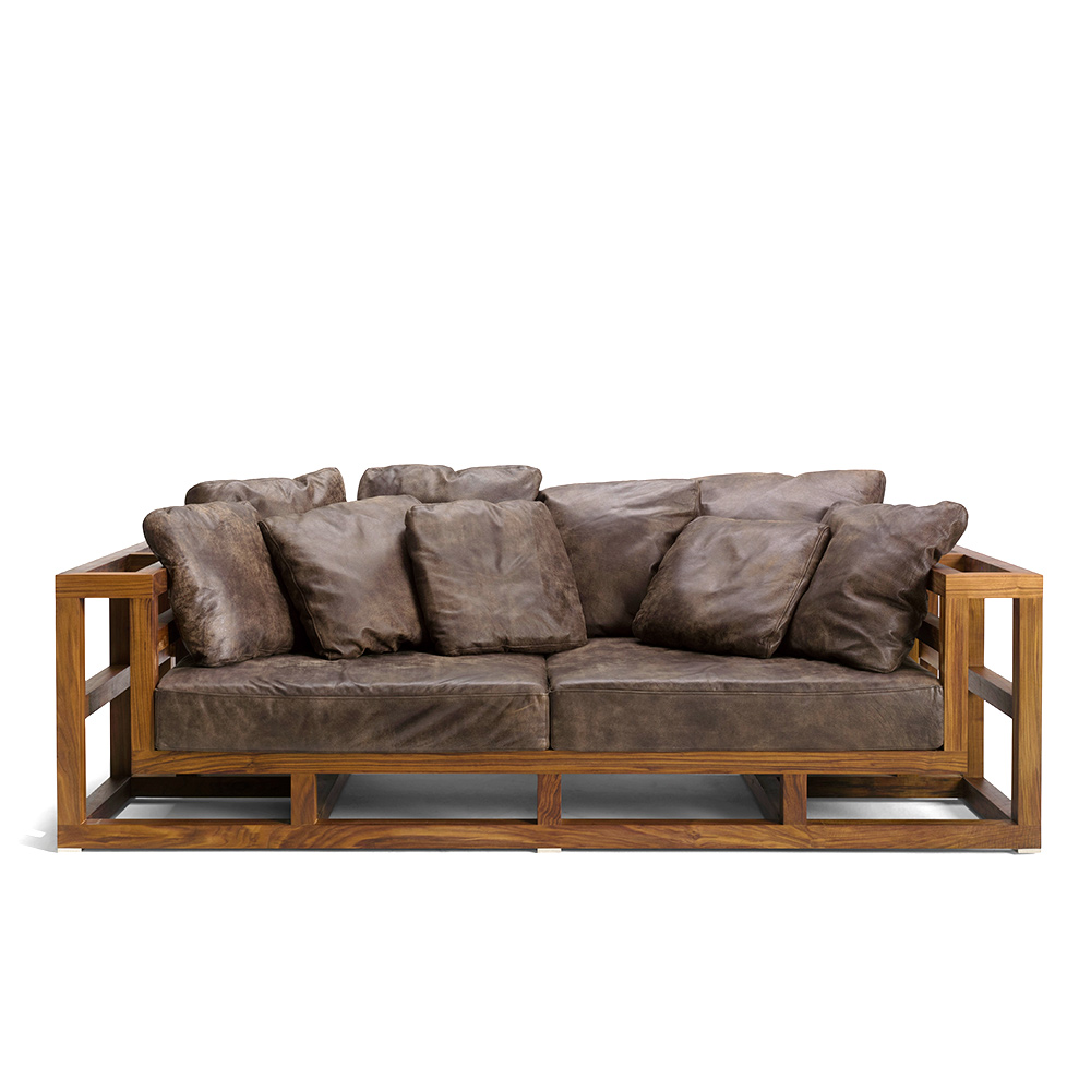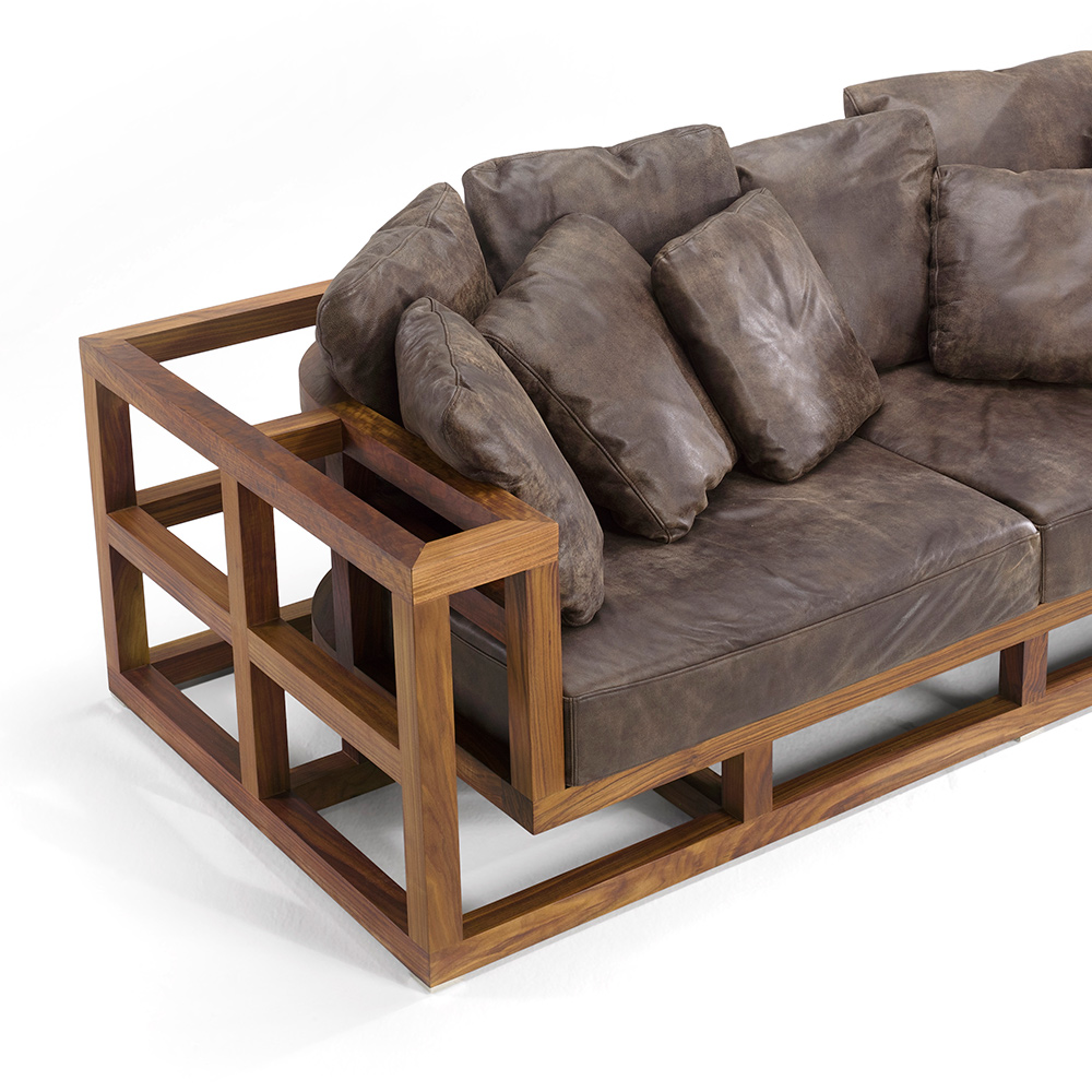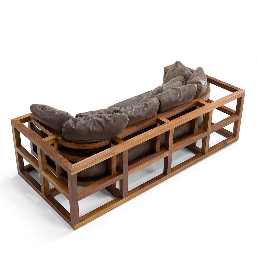 Диван SKELETON SOFA с оригинальным дизайном. Подушки обтянуты кожей серого цвета. Каркас выполнен из массива американского ореха, полностью ручная работа. Крепкая древесина, обладающая высокой степенью стабильности и длительным сроком службы. Поверхность богата структурными линиями и прожилками, цвет темный с просветлениями дает эффектные цветовые контрасты в интерьере. Мастера Camus Collection используют древесину из экологичных насаждений, где поддерживаются циклы лесовосстановления. Кожаные подушки с эффектом старения.