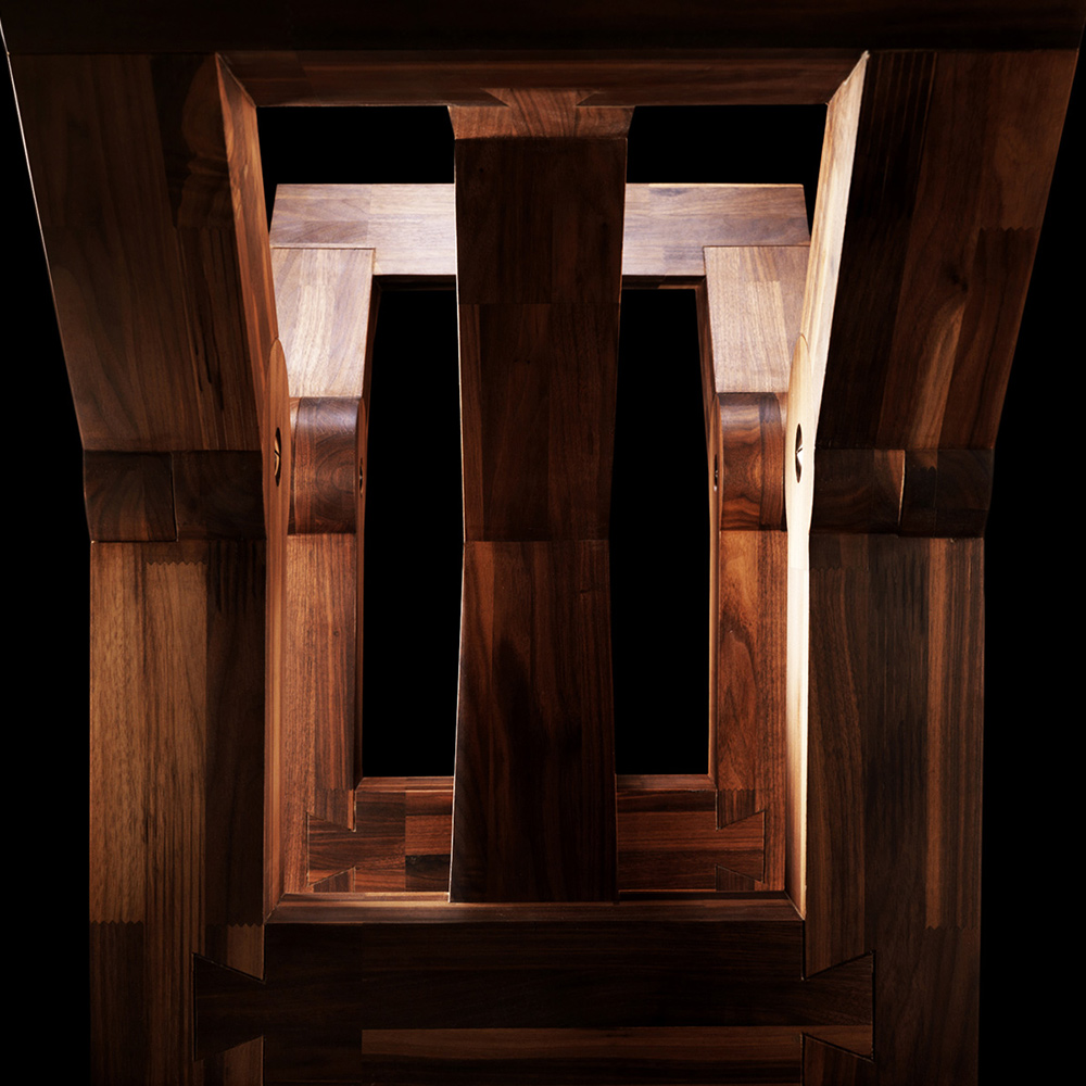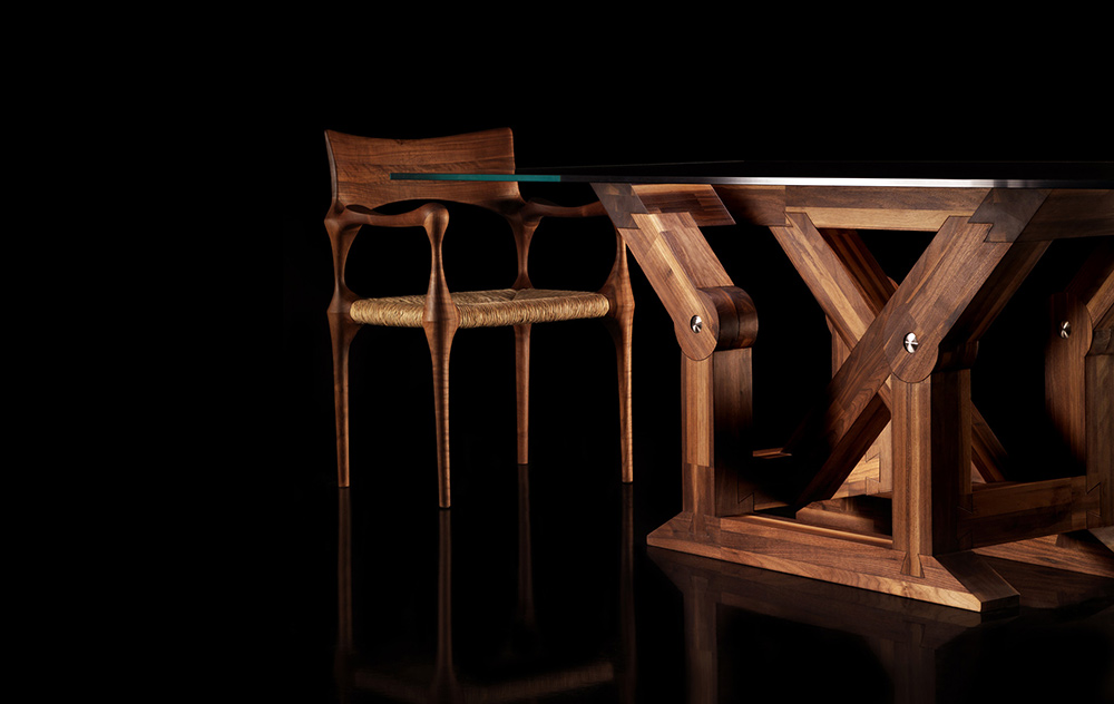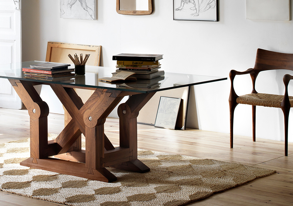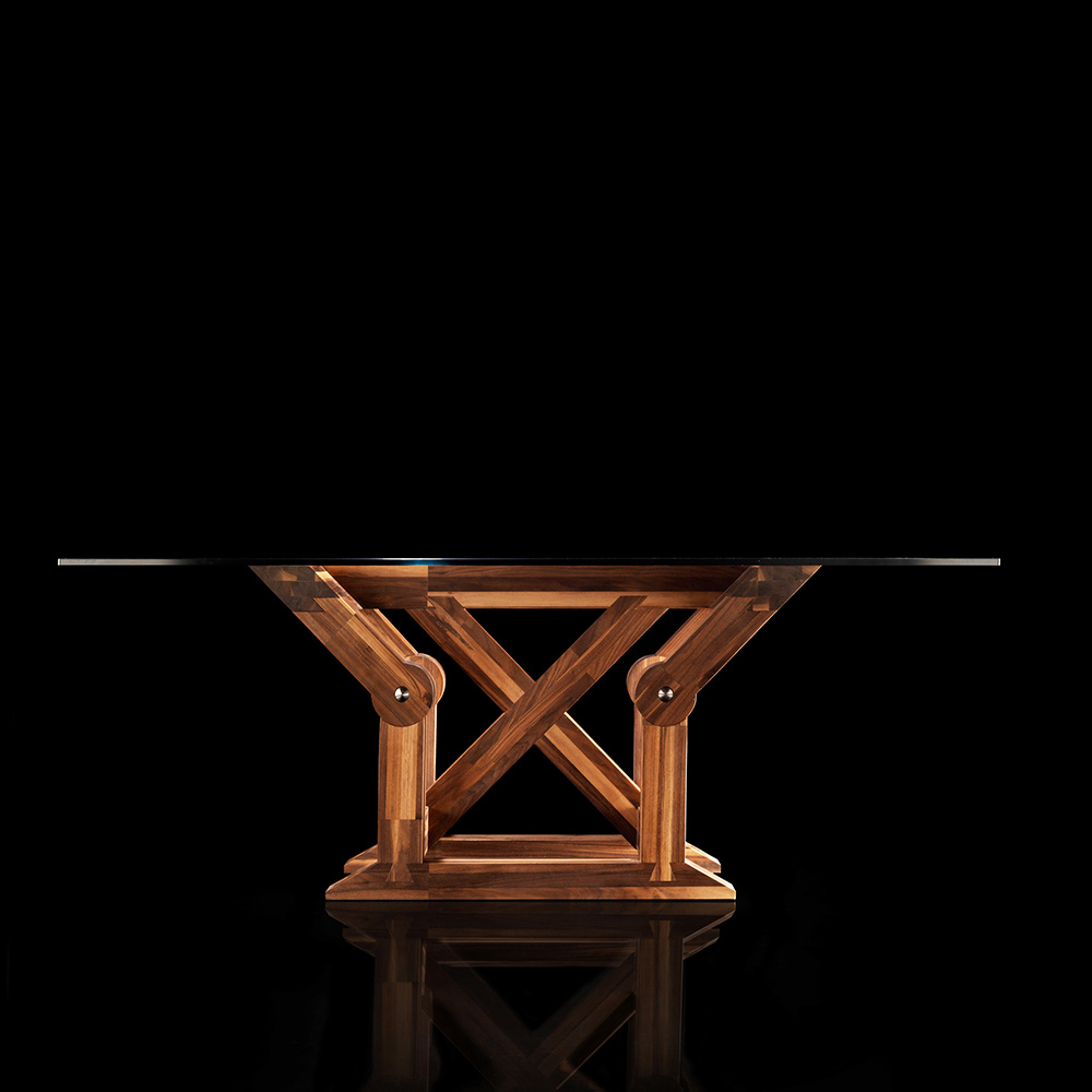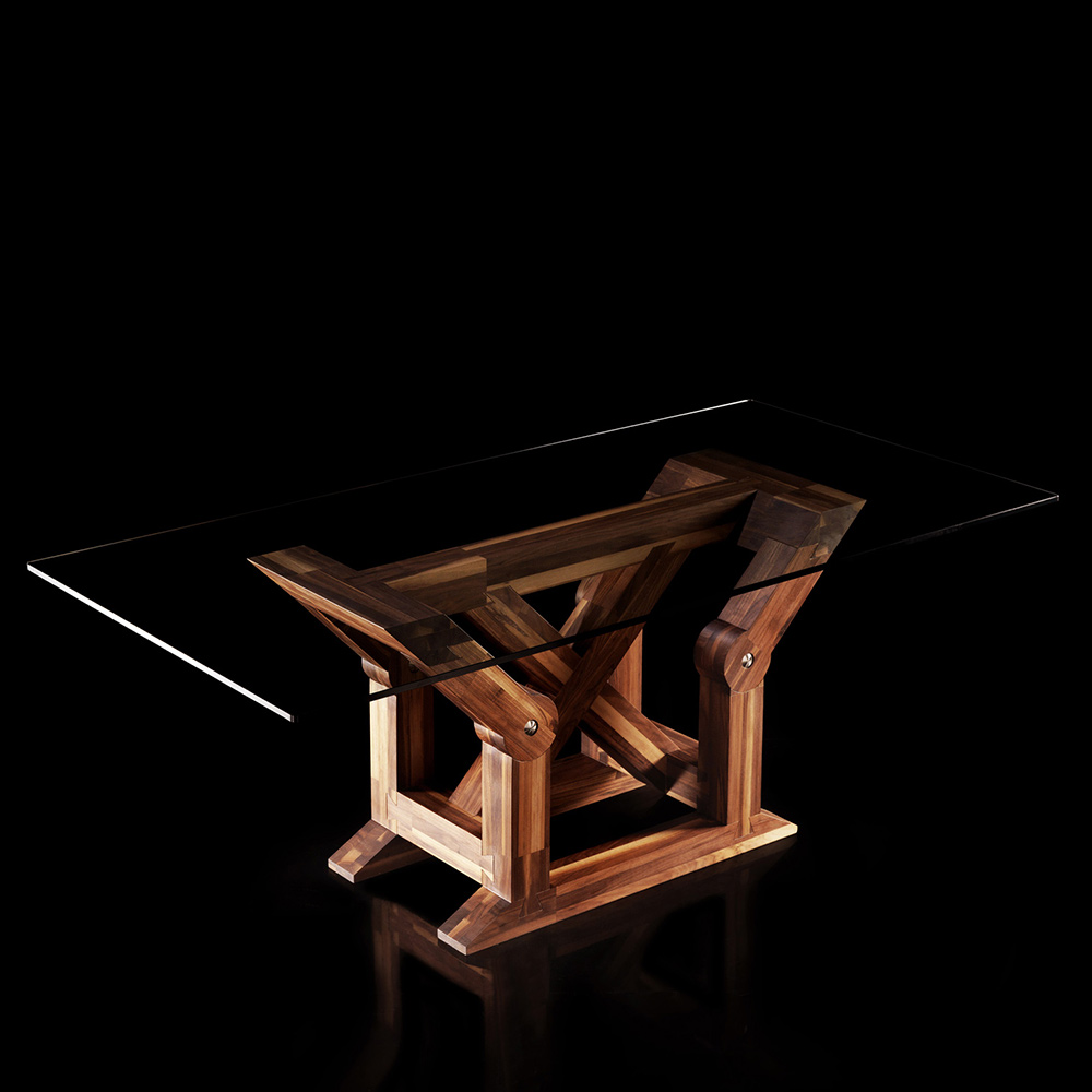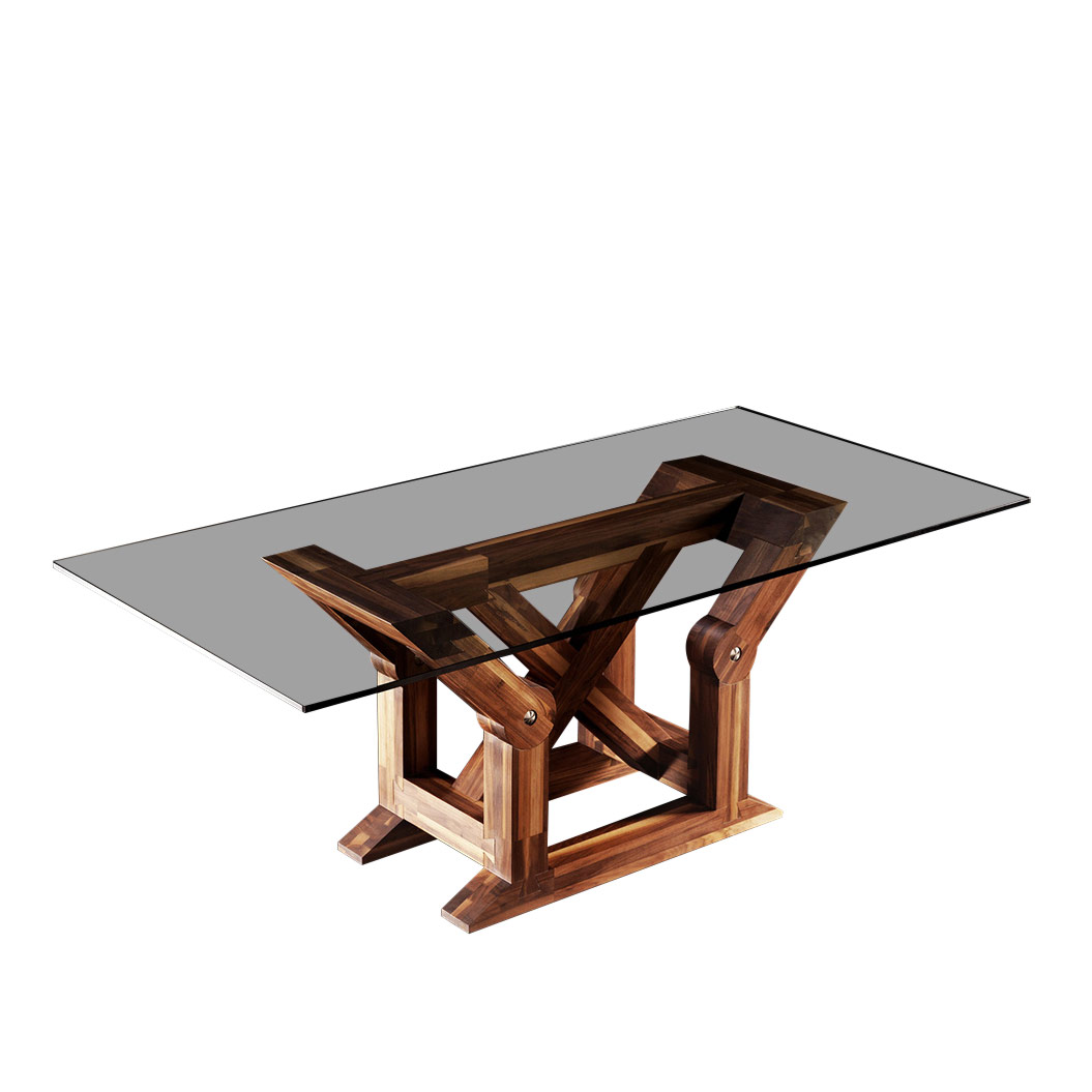 Обеденный стол SFORZA DINNING TABLE с оригинальным дизайном выполнен из массива американского ореха, полностью ручная работа. Столешница выполнена из плотного прозрачного стекла. Крепкая древесина, обладающая высокой степенью стабильности и длительным сроком службы. Поверхность богата структурными линиями и прожилками, цвет темный с просветлениями дает эффектные цветовые контрасты в интерьере. Мастера Camus Collection используют древесину из экологичных насаждений, где поддерживаются циклы лесовосстановления.