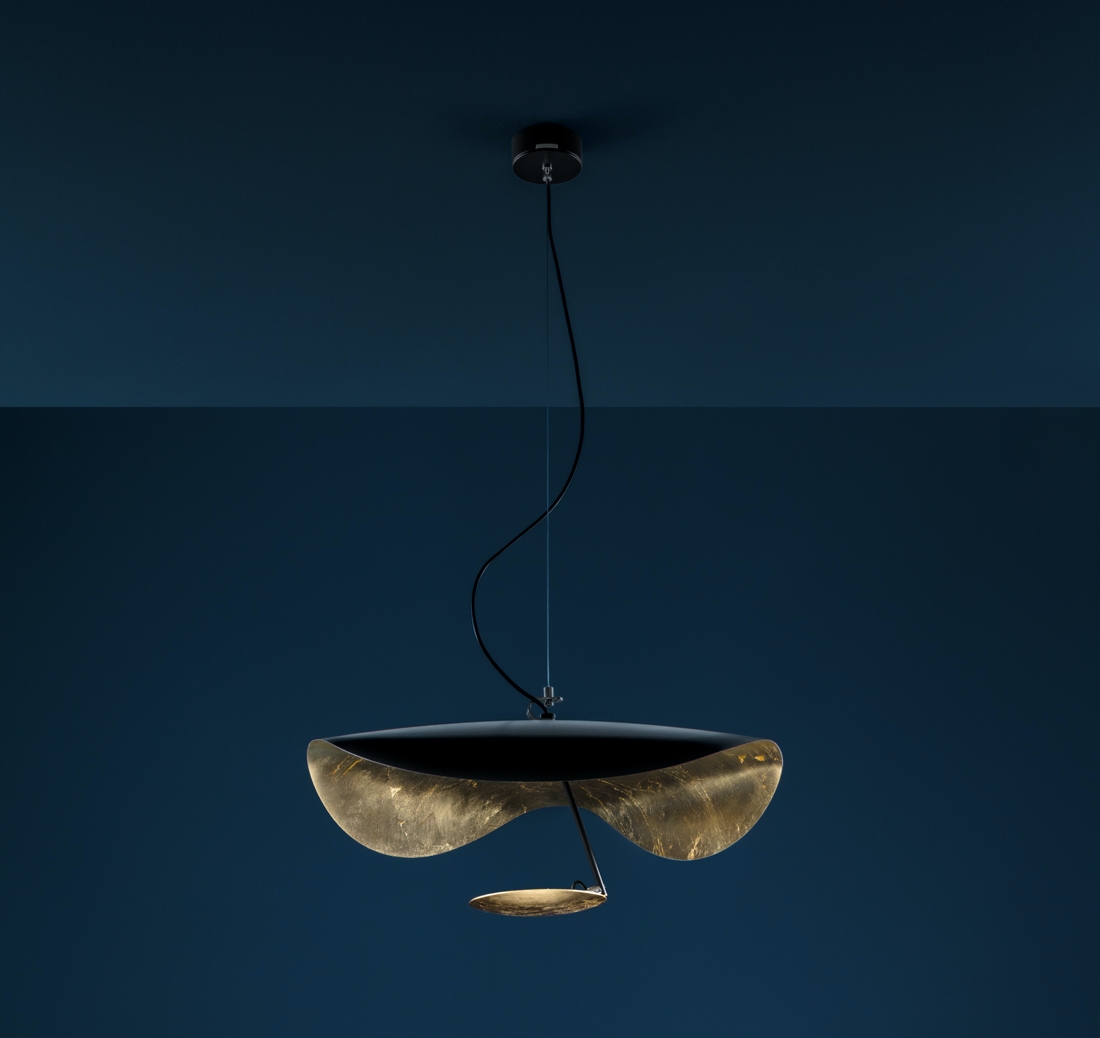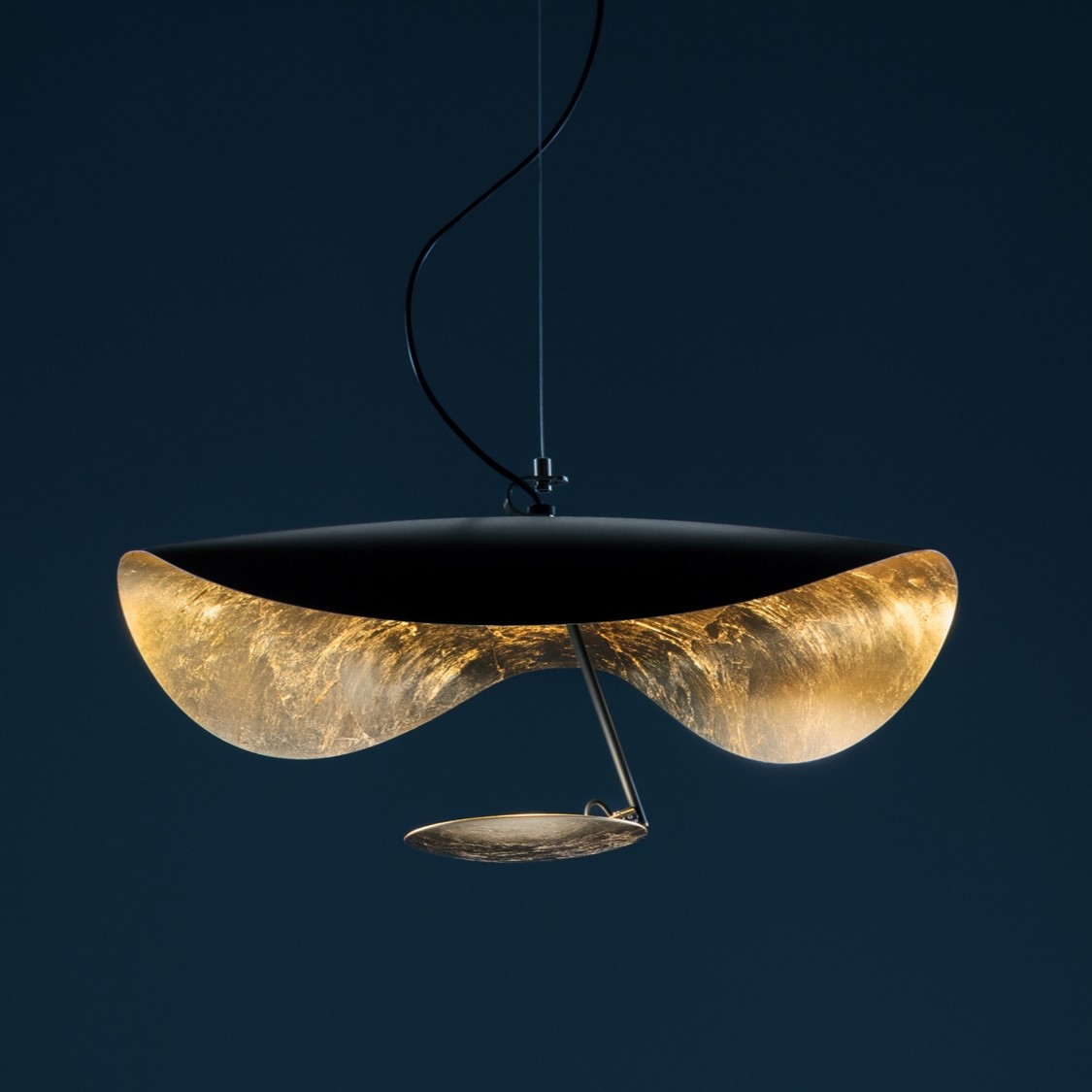 Подвесной светильник Catelleni & Smith Lederam Manta конструктивно состоит из плоского светодиодного модуля и алюминиевого диска, который становится уютным и теплым отражателем для света, создавая красивые блики на металлической поверхности. Мягкие формы изогнутого диска напоминают изящные рисованные линии.
