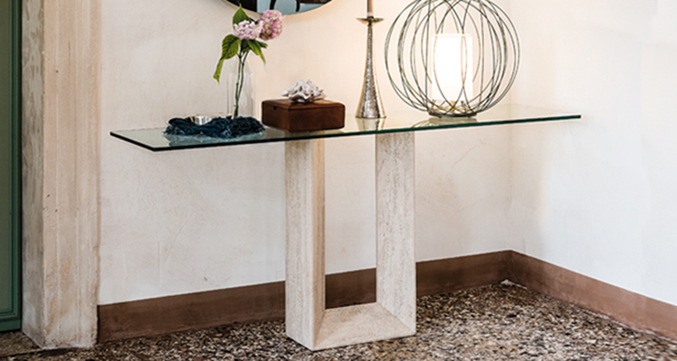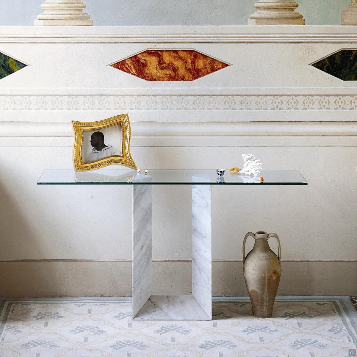 П-образное основание из роскошного белого каррарского мрамора, в сочетании с прямоугольной столешницей из прозрачного стекла толщиной 12мм, создает ощущение уточнённой монументальности.