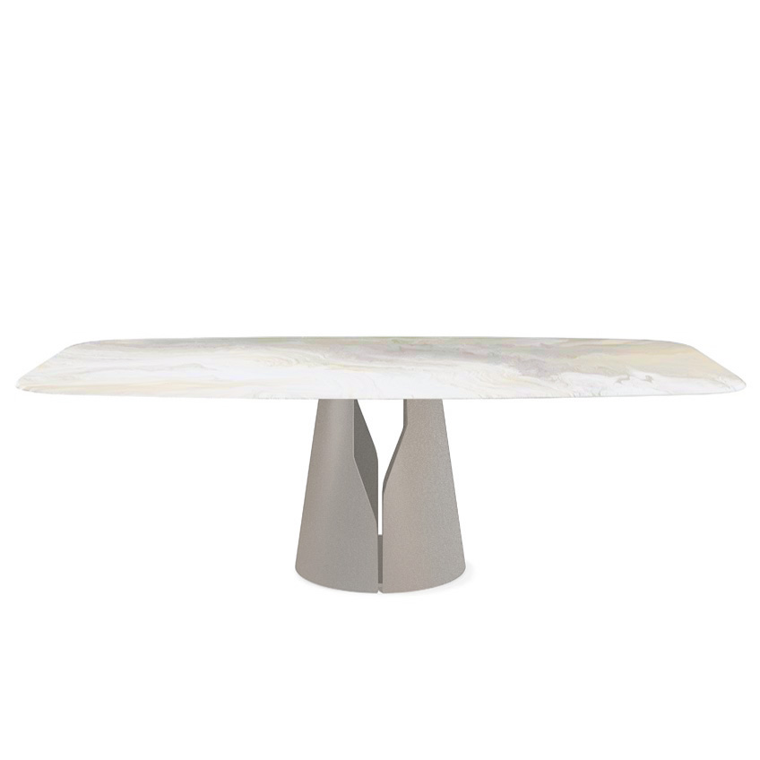 Обеденный стол Cattelan Italia Giano Keramik. Основание из лакированной стали жемчужного цвета (GFM70), столешница из керамики под мрамор, цвет Golden calacatta (KM05).