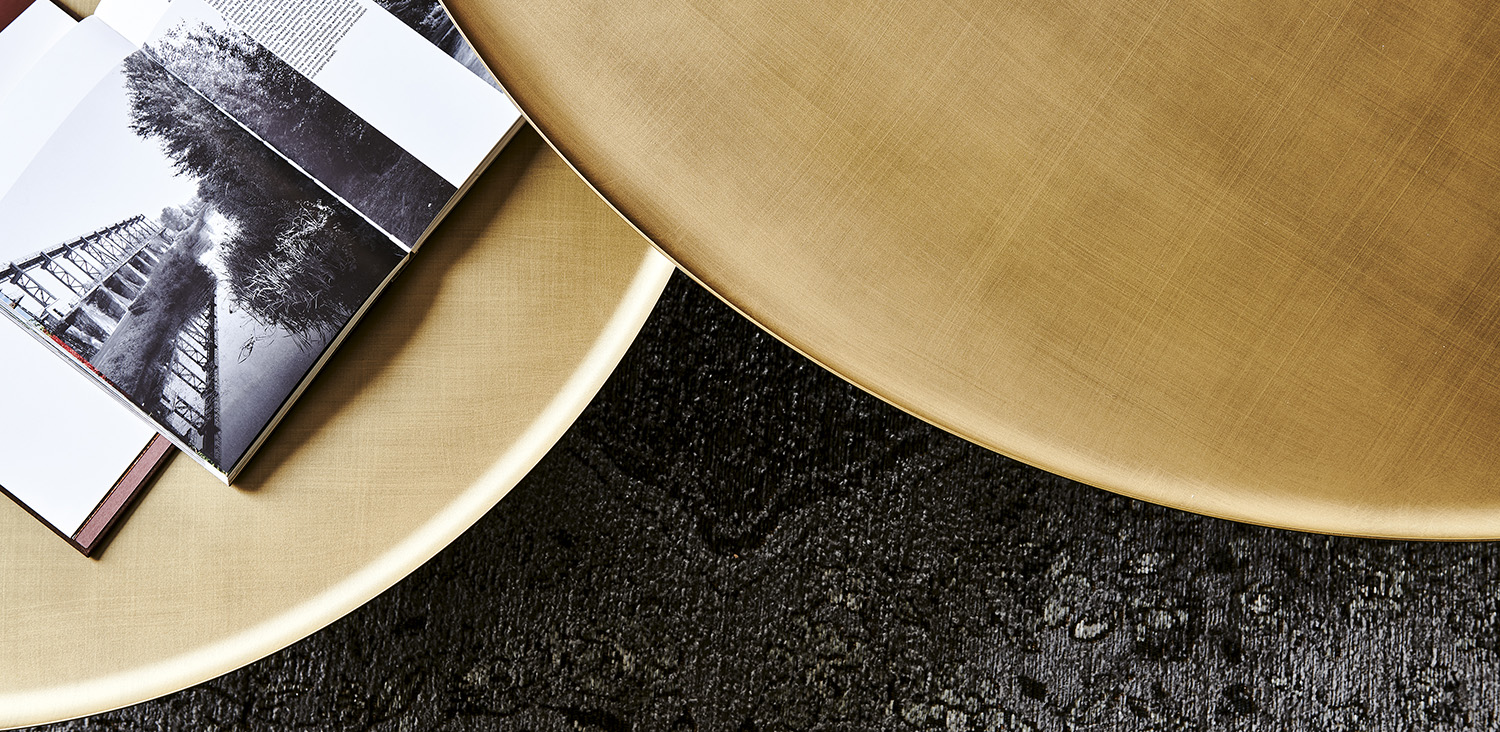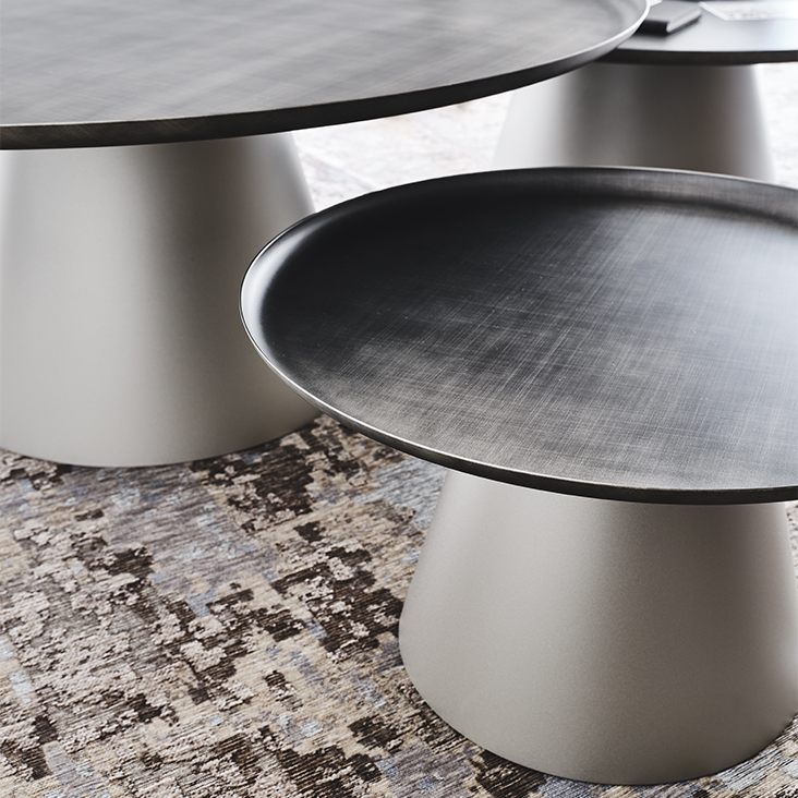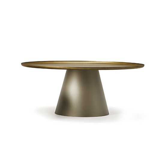 Журнальный стол Cattelan Italia Amerigo 38. Основание из лакированной стали с тиснением под титан и столешницей из лакированной стали латунного цвета. По запросу доступны различные размеры столов с серой или бронзовой столешницей. Дизайн: Giorgio Cattelan, 2019.