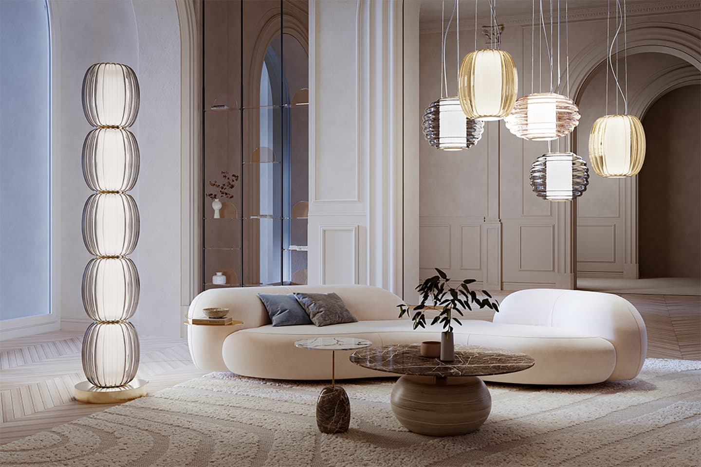 Светильники Alma – результат коллаборации c дизайнерами миланской студии Controvento, грациозное олицетворение поэтического света, облаченного в выдувное стекло и плиссированные тканевые формы. Скульптурность облика и нежная тональность задают мягкий характер коллекции, представленной подвесными, настольными и напольными светильниками.