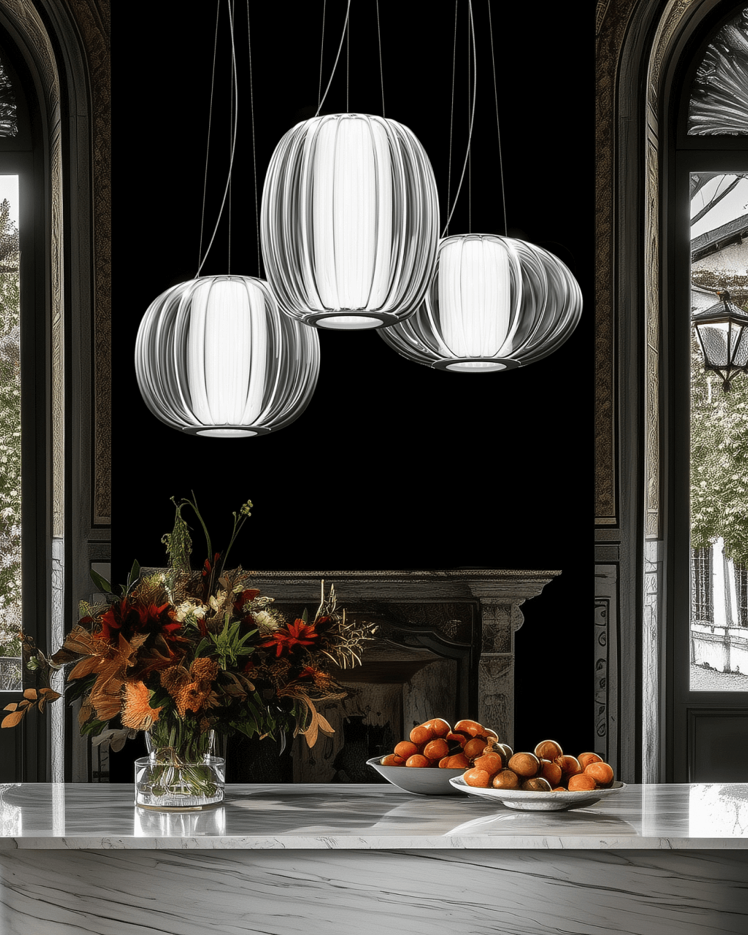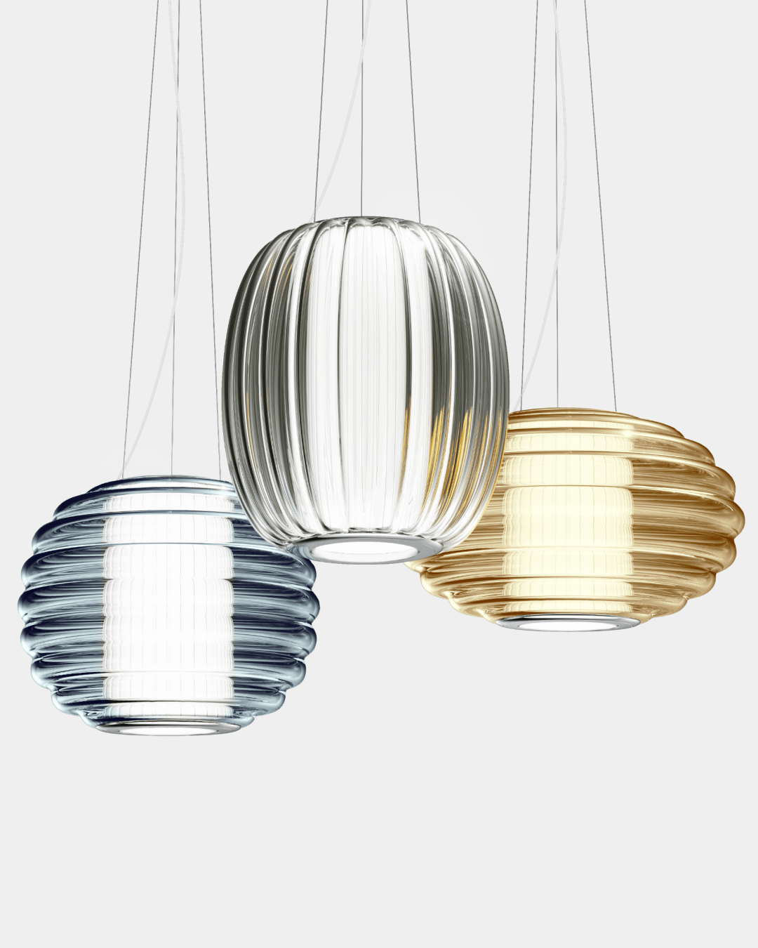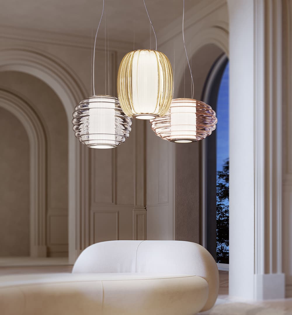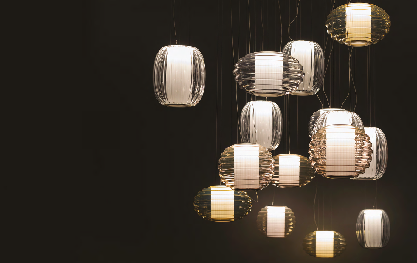 Светильники Alma – результат коллаборации Contardi и дизайнеров Controvento, грациозное олицетворение поэтического света, облаченного в выдувное стекло и плиссированные тканевые формы. Скульптурность и нежная тональность задают стильный характер коллекции, представленной подвесными, настольными и напольными светильниками.