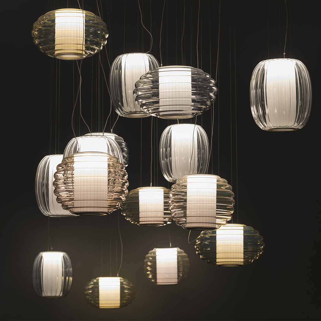 Светильники Alma – результат коллаборации c дизайнерами Controvento, грациозное олицетворение поэтического света, облаченного в выдувное стекло и плиссированные тканевые формы. Скульптурность и нежная тональность задают неповторимый стиль коллекции, представленной подвесными, настольными и напольными светильниками.