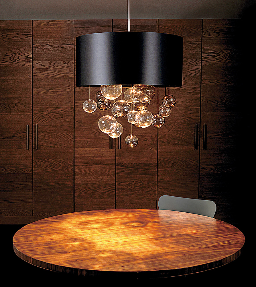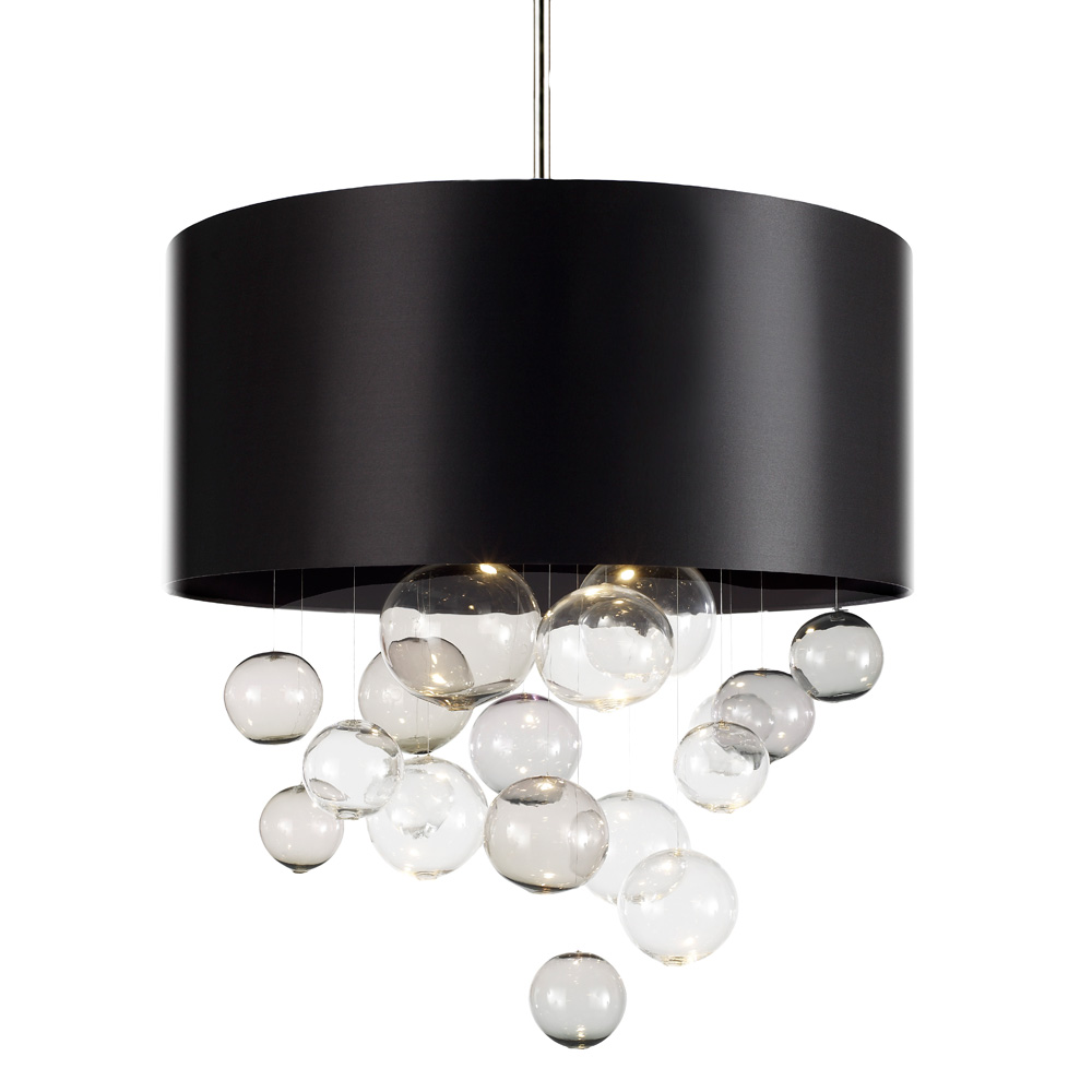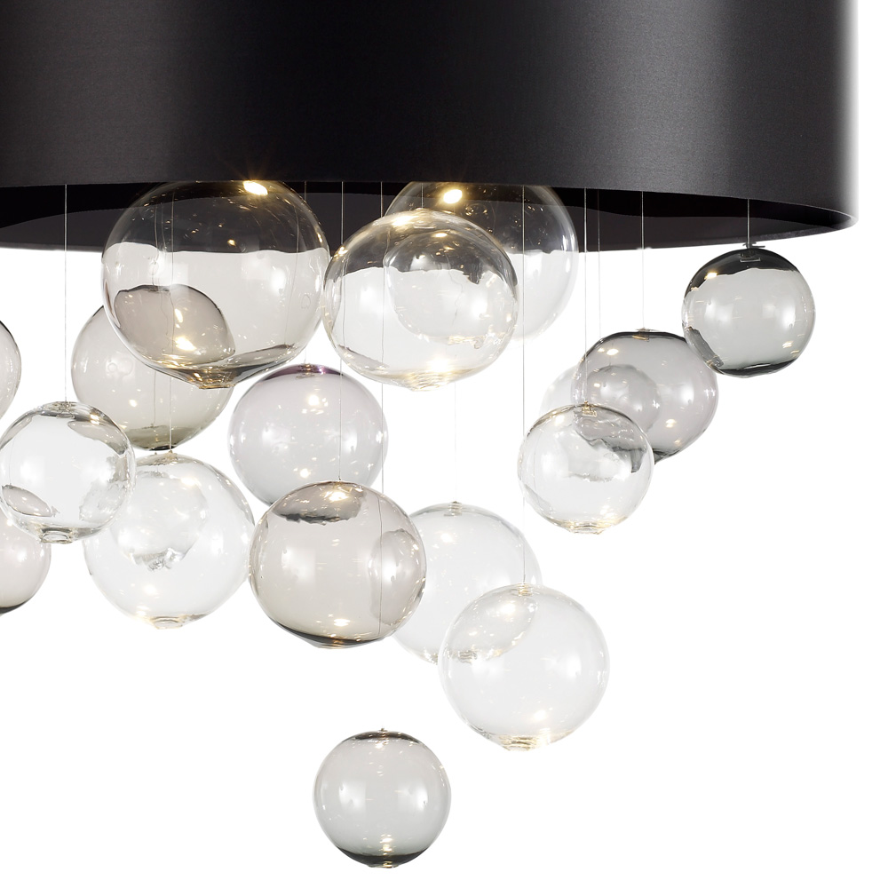Подвесной светильник из коллекции Aero на никелированной арматуре. Плафон выполнен из шелковой ткани черного цвета снаружи и золотого внутри. Декор: стеклянные шары прозрачного, коричневого и серого цветов. Возможны другие варианты покрытия металла. Высота светильника регулируется до 170 см.