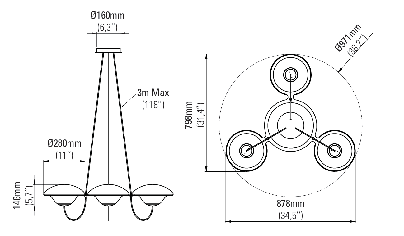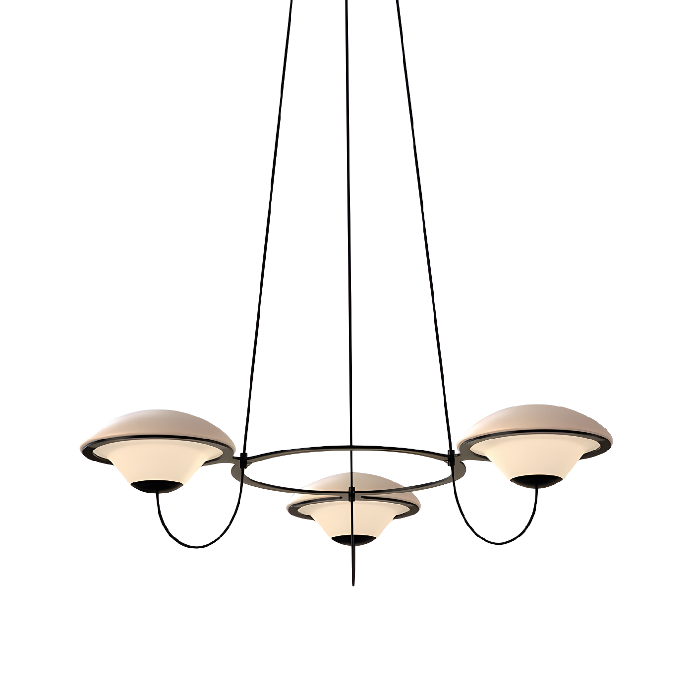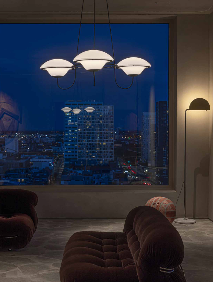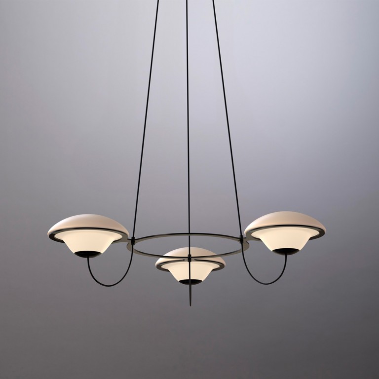 Минималистичная люстра In The Air создана Дугласом Монтом под впечатлением от культового романа «Дюна». Автор соединяет стилистику ретрофутуризма и классические формы: плафоны светильника повторяют силуэт летающих тарелок, вместе с тем напоминая модные в Италии 1960-х тотемные светильники.