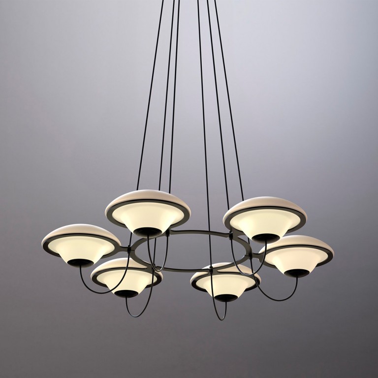 Роскошный подвесной светильник In The Air создан Дугласом Монтом под впечатлением от культового научно-фантастического романа «Дюна». Соединив ретрофутуризм и узнаваемую классику, дизайнер создал радиусный подвесной светильник, удерживающий шесть плафонов UFO-силуэта, напоминающих летающие тарелки, и отсылающих к популярным в Италии тотемным ретро-светильникам 1960-х.