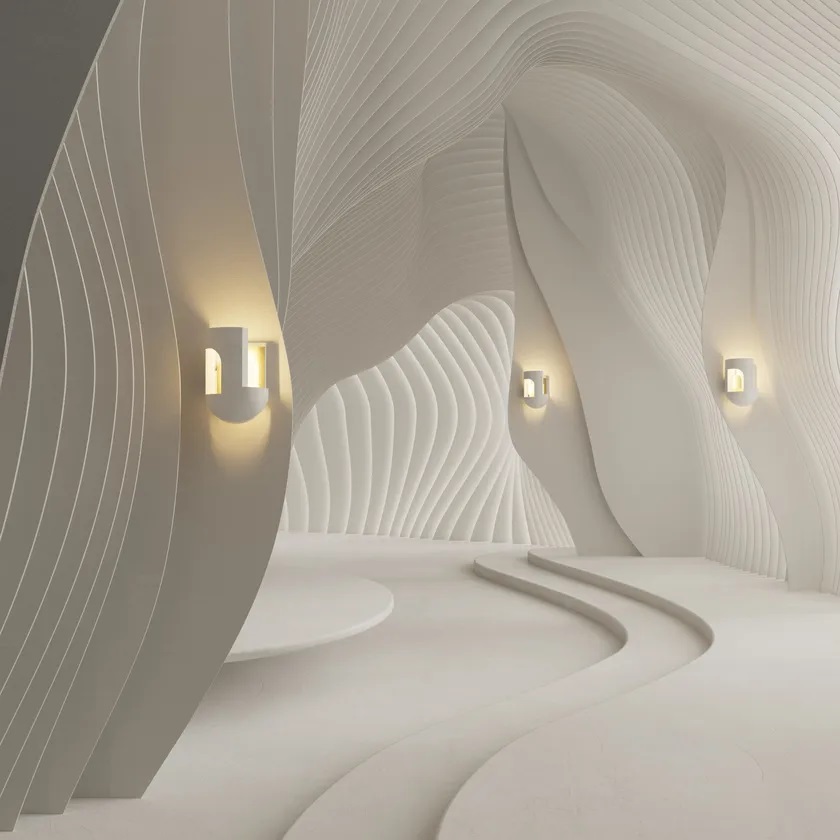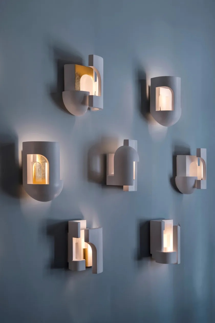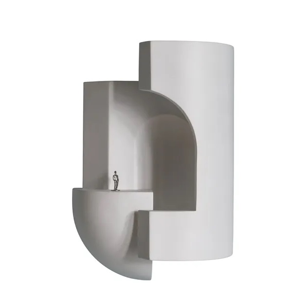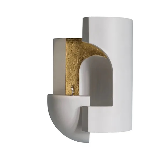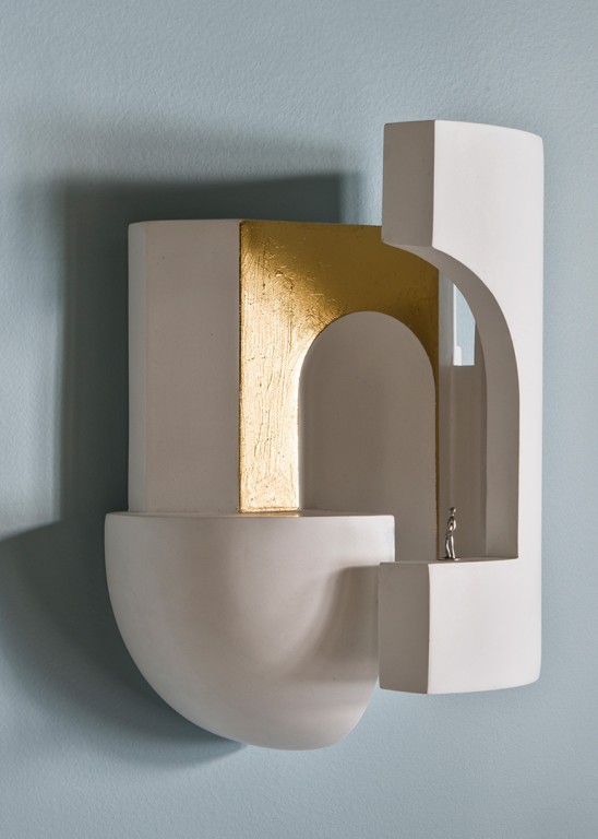 Гипсовый настенный светильник — миниатюрный город, будто приглашающий к путешествию за светом. Автор предлагает созерцать перспективу глазами крошечного металлического персонажа, помещенного в белостенный корпус.