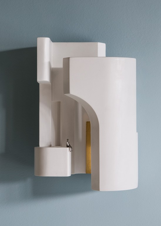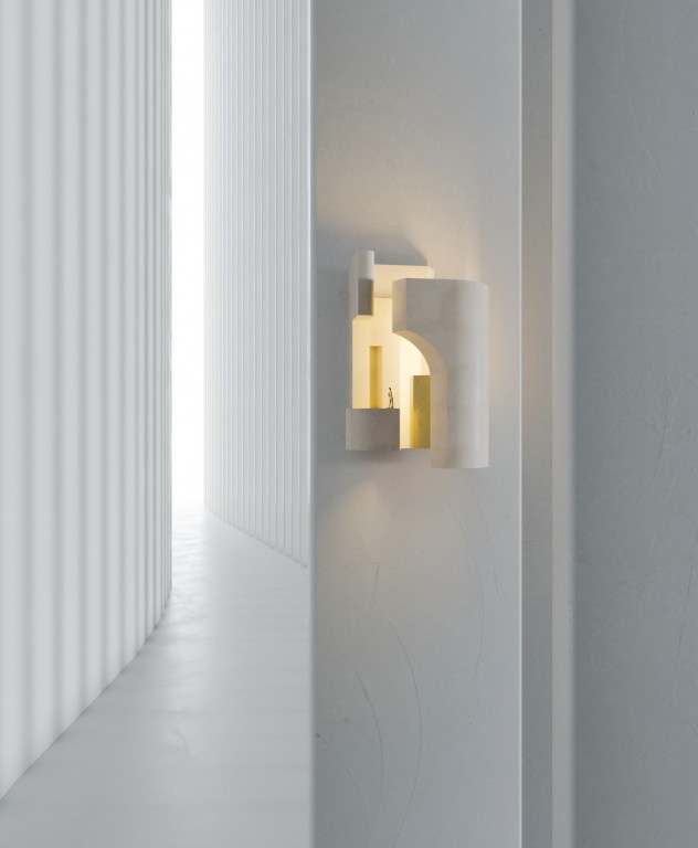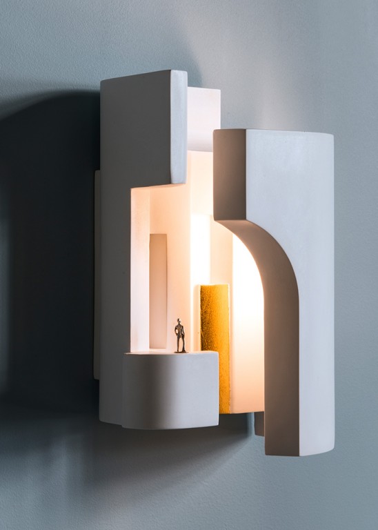 Гипсовый белый светильник оживлен двумя маленькими металлическими персонажами, наблюдающими за рождением света. Прекрасное светотехническое решение для холлов, гостиных, входных групп, ресторанов, отельных интерьеров и других внутренних пространств, нуждающихся в переосмыслении.