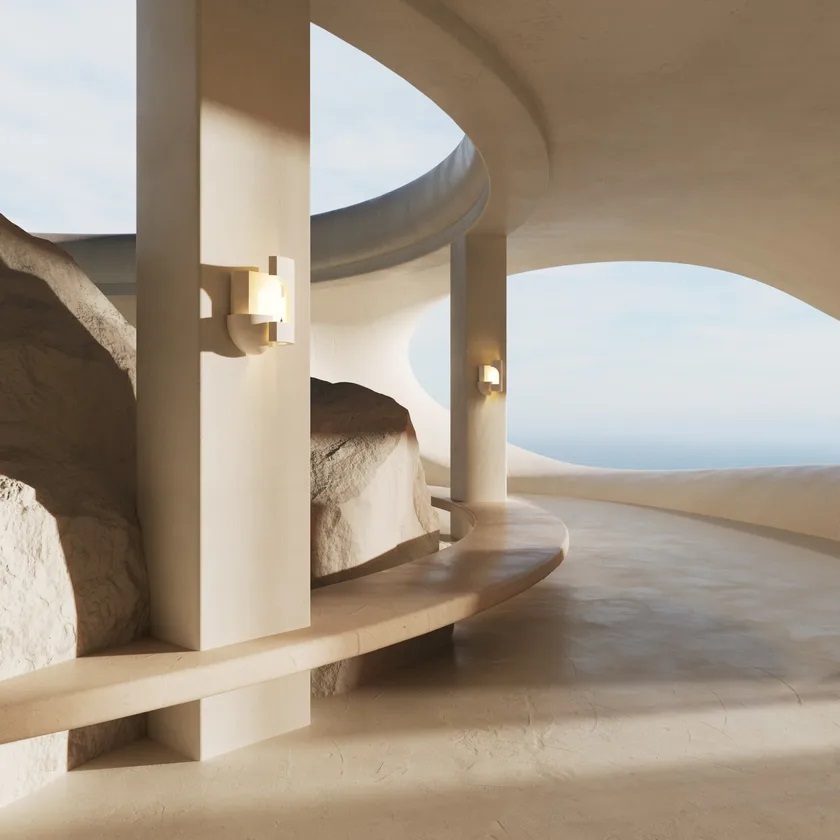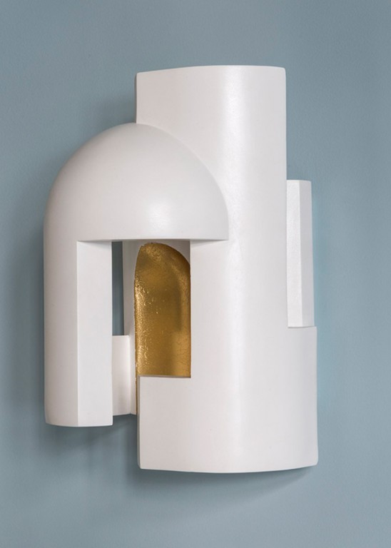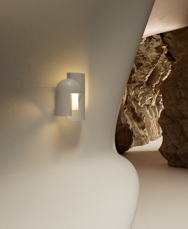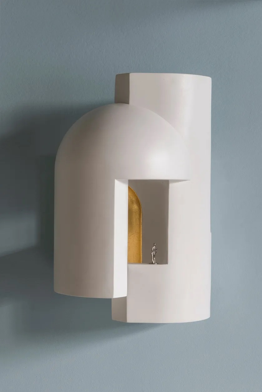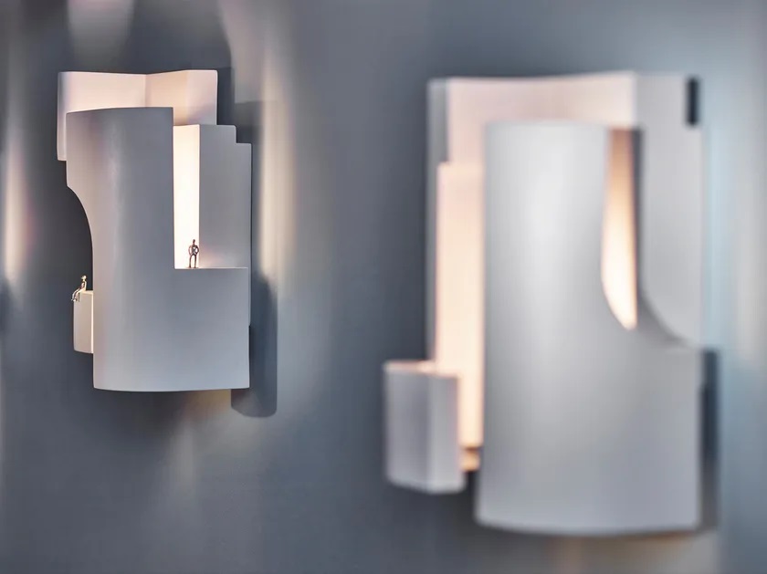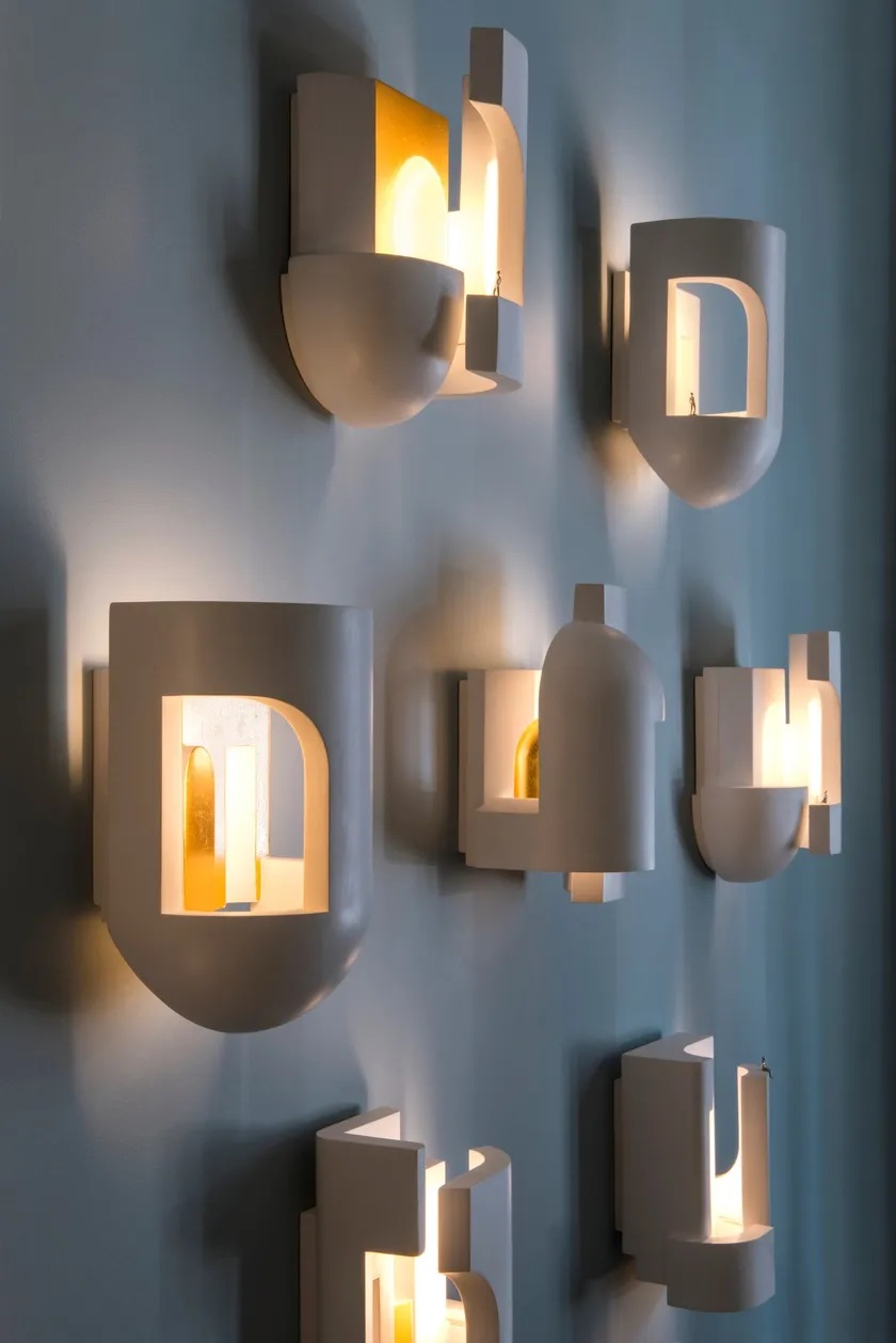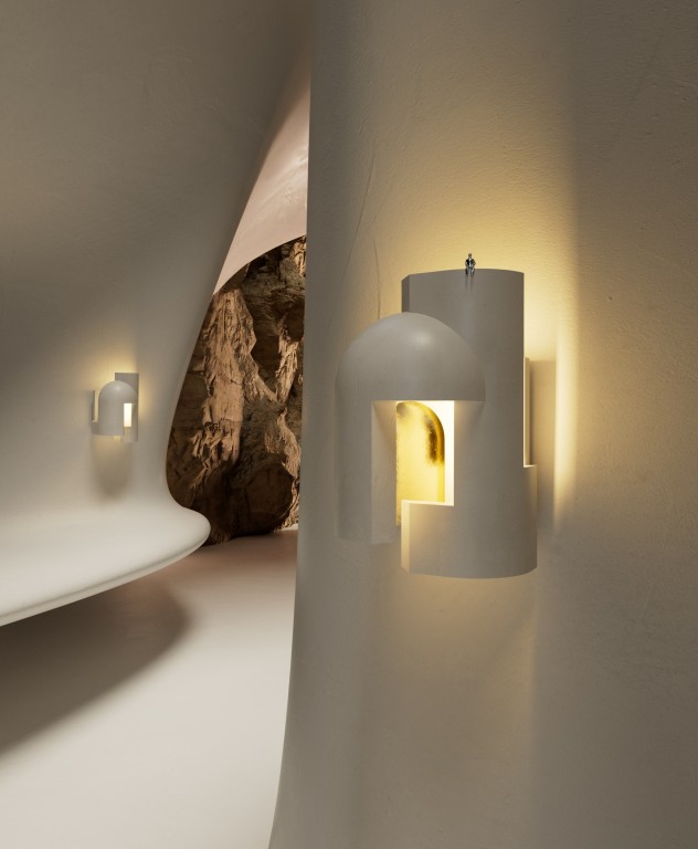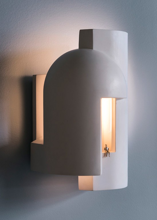 Гипсовый настенный светильник приглашает к путешествию на сумеречную глубину, где взгляд улавливает пронзительный луч света. Нам предлагают созерцать каждую модель глазами крошечного металлического персонажа, помещенного в объемный корпус.