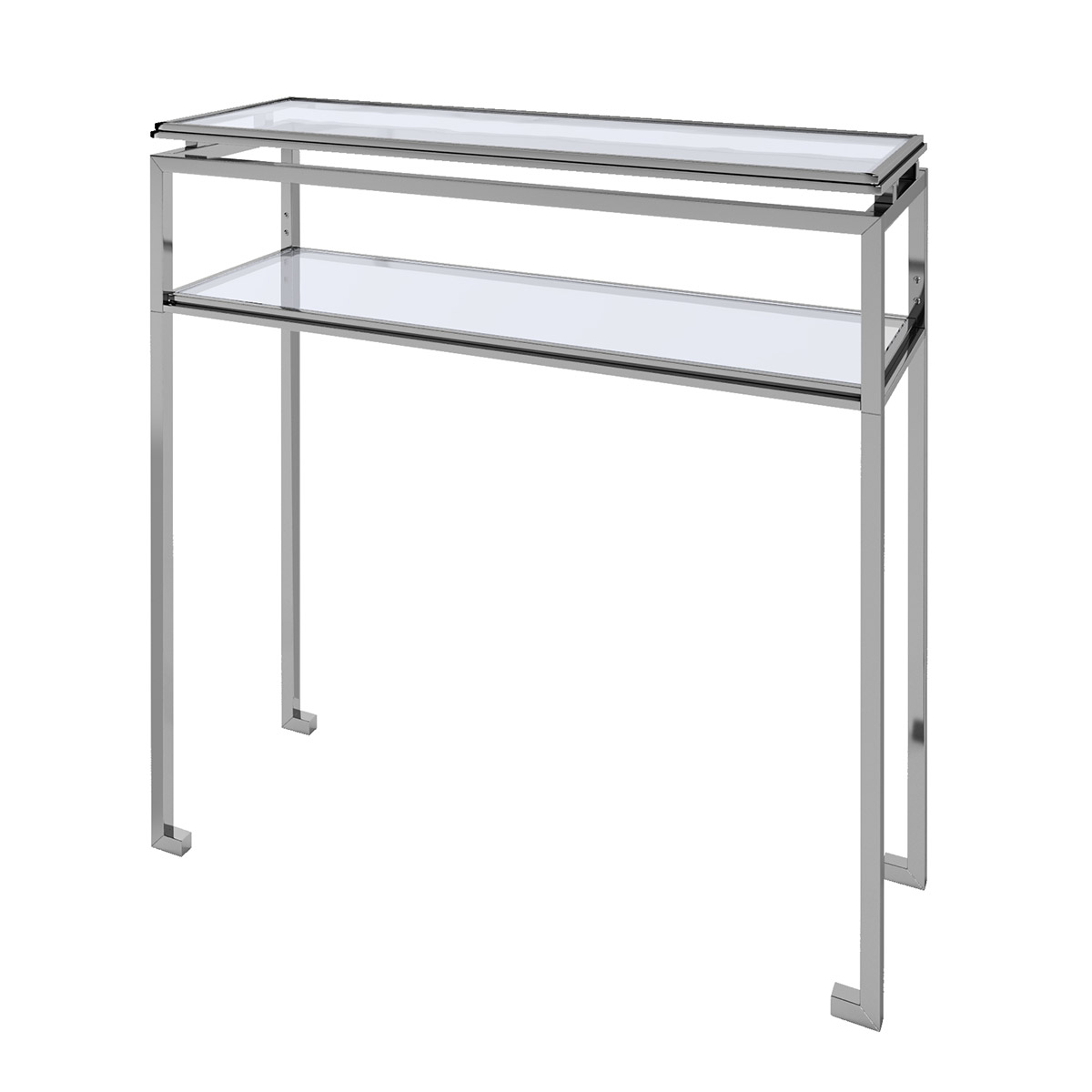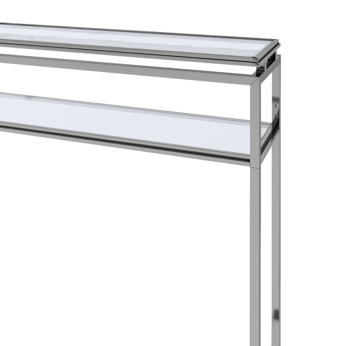 Консоль из хромированного металла со столешницей из стекла черного цвета.