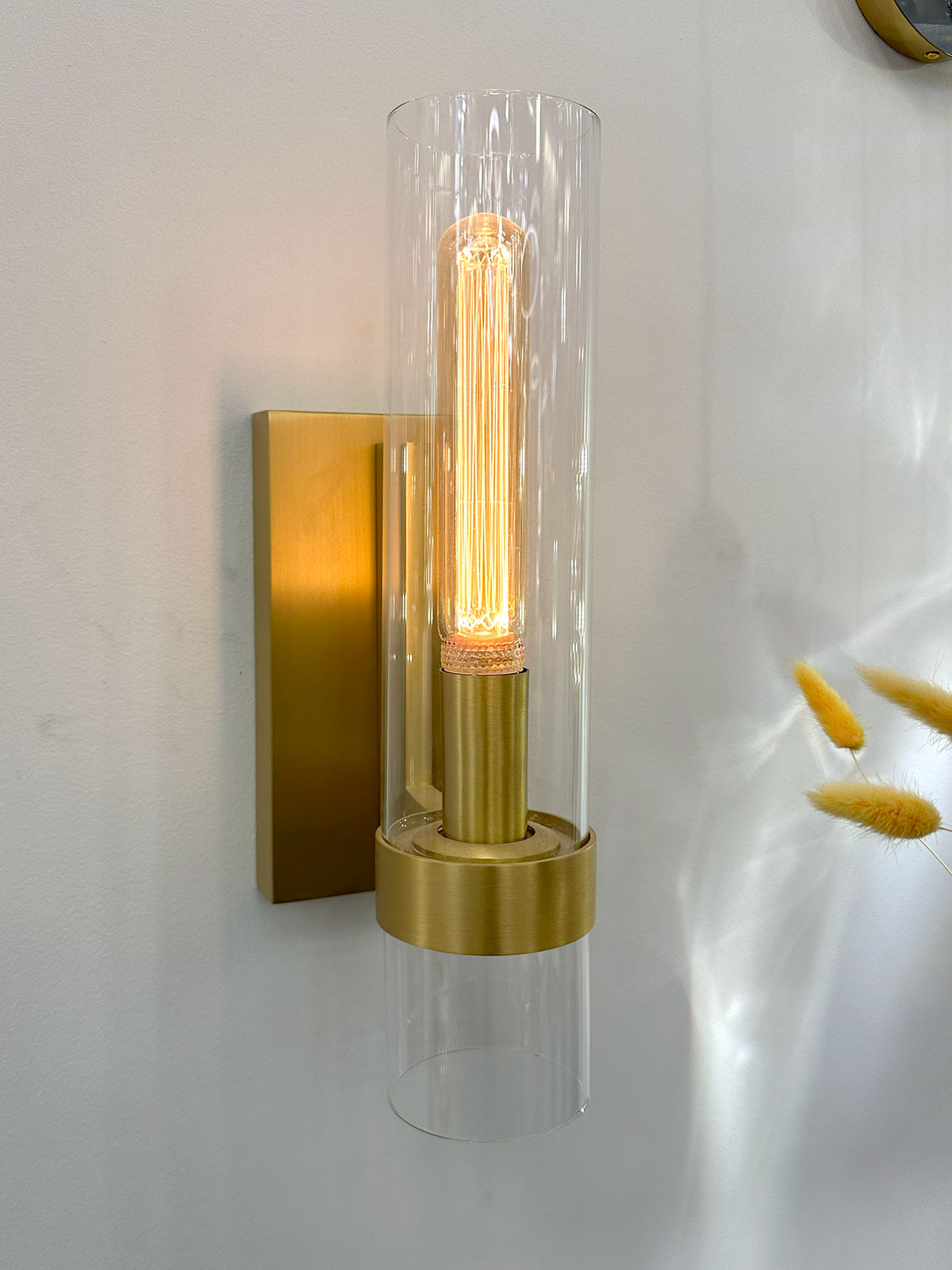 Настенный светильник Delight Collection MT8869-1W brass с высокими цилиндрическим плафоном из прозрачного стекла. Основание светильника из металла цвета латунь.
