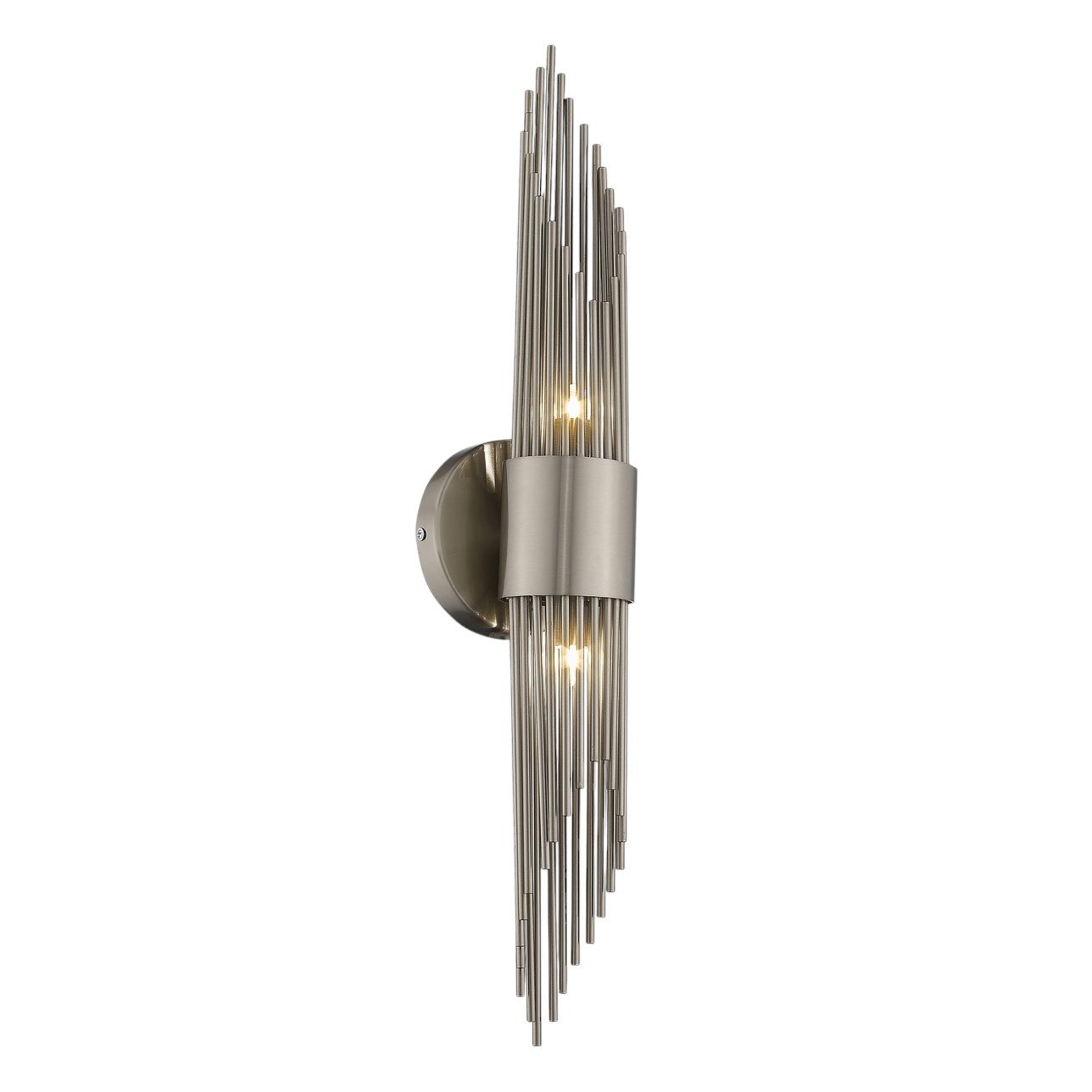 Настенный светильник с одним плафоном из тонких металлических стержней разной длины. Отделка металла никель.