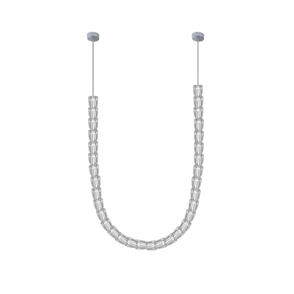 Подвесной светильник Delight Collection 8301P/3000 clear с двумя потолочными креплениями и множеством плафонов из прозрачного акрила, нанизанных на основу как ожерелье . Светильник состоит из 33-х плафонов и в каждом распологается источник света. Общая длина светильника 3 метра. Металлические части хромированные.