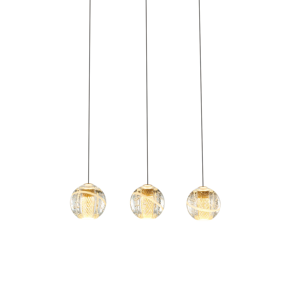Подвесной светильник Delight Collection MD22001052-3B gold с тремя подвесами на вытянутом основании золотого цвета. Плафоны из прозрачного стекла с мелкими пузырьками внутри.