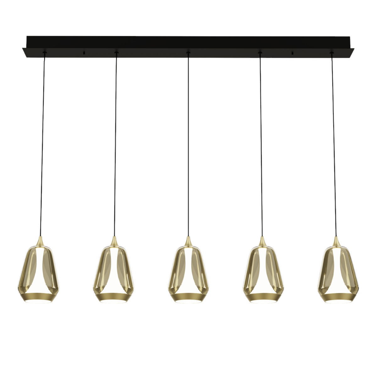 Подвесной светильник Delight Collection MD24001011-5B brass/champagne с пятью подвесами на планке черного цвета. Плафоны из стекла цвета шампань с латунными элементами. Внутри плафонов рассеиватели из матового акрила.