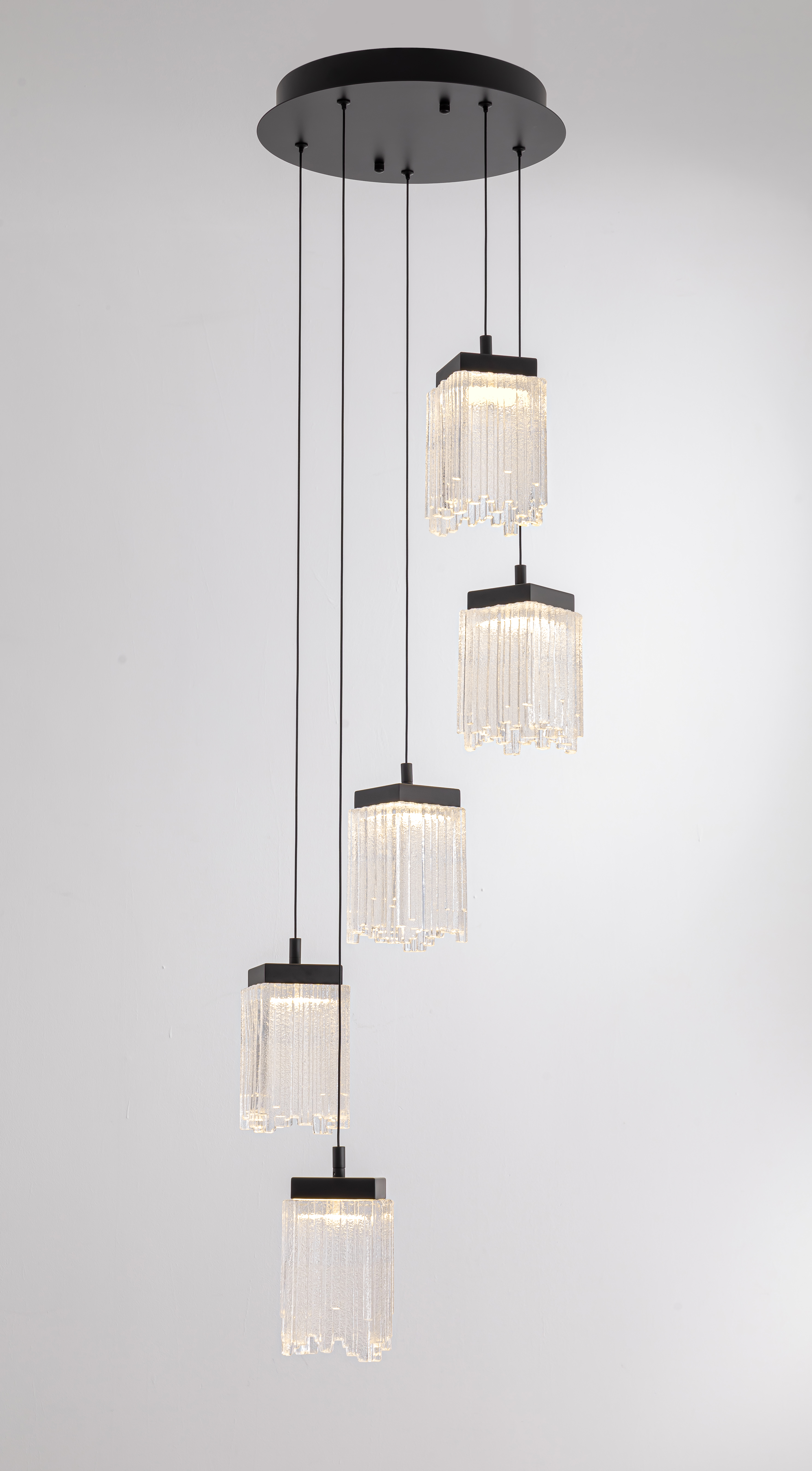 Подвесной каскадный светильник Delight Collection MD25020403-5A1 Matt black с пятью квадратными фактурными плафонами из полупрозрачного белого стекла и металлическим основанием матово-черного цвета.