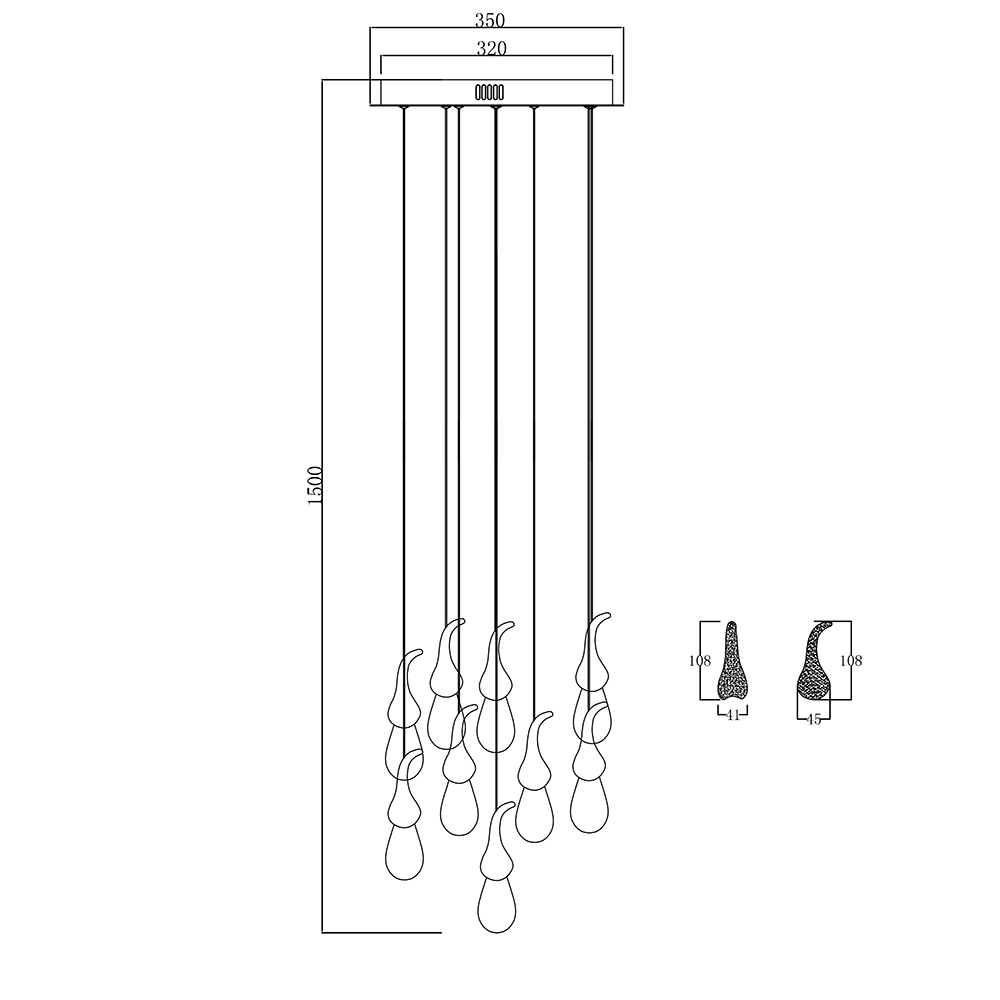Подвесной светильник Delight Collection OMG07287-9 с девятью подвесами на круглом основании. Плафоны из каплевидного прозрачного стекла с оригинальным декором из металла. Металлические части золотого цвета.