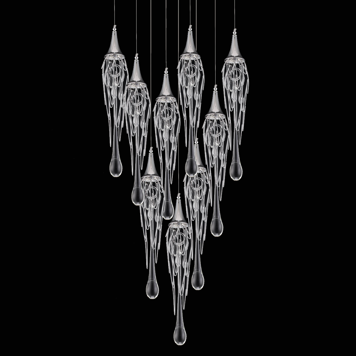 Светильник с девятью подвесами. Каждый плафон выполнен из тонкой хромированной проволоки, внутри одна большая (высота 35 см) и несколько маленьких стеклянных капель. Высота одного элемента 58 см.
