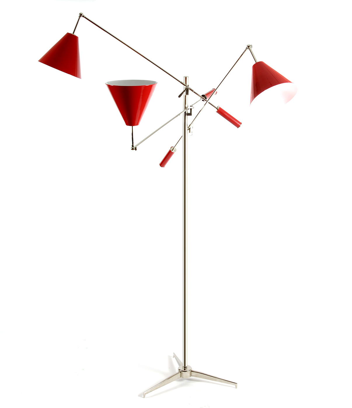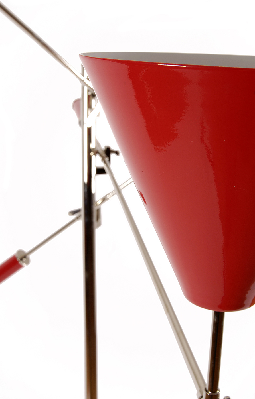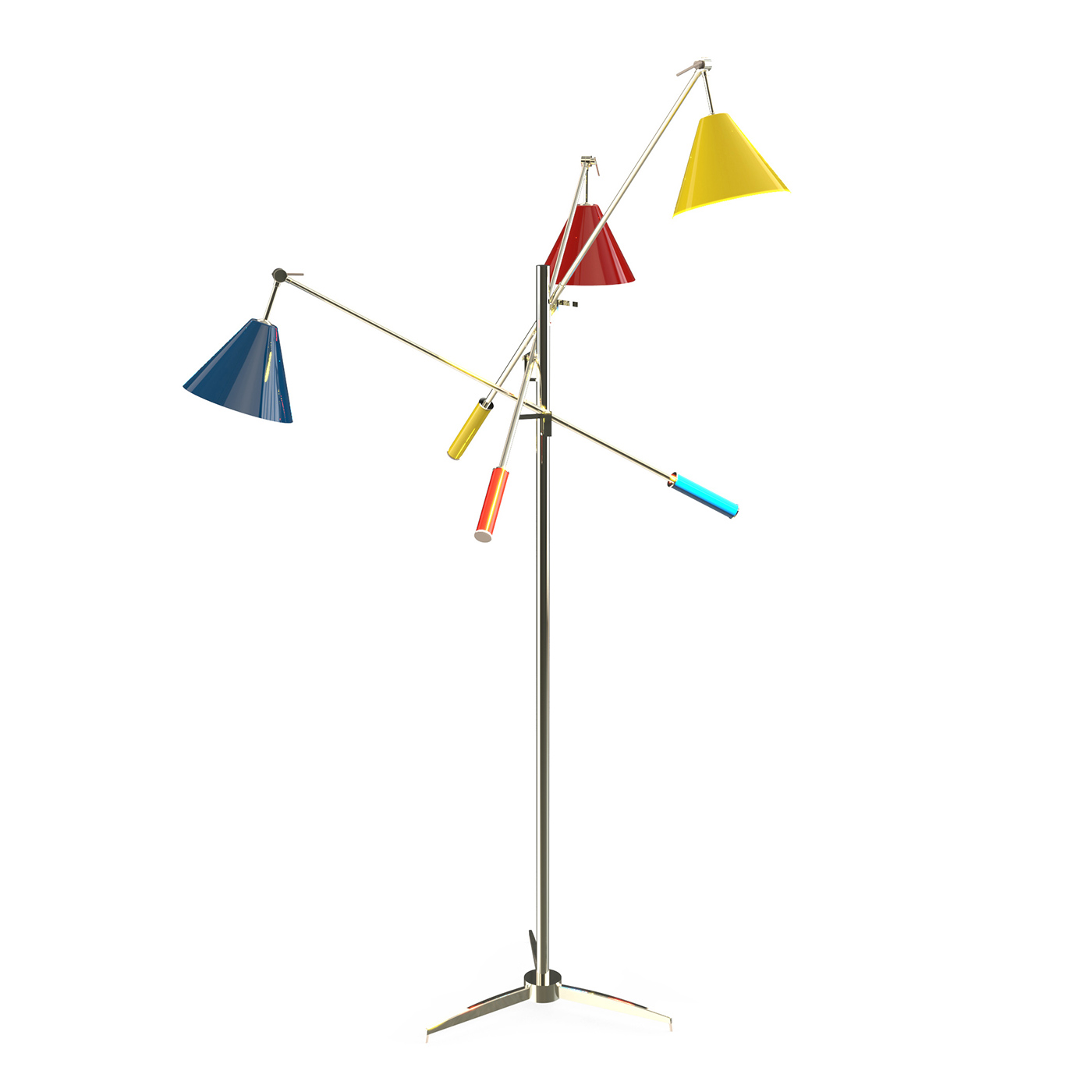 Торшер из коллекции SINATRA на никелированной арматуре. Плафоны из металла красного, синего и желтого цвета. На заказ возможны различные цветовые вариации плафонов и металла.