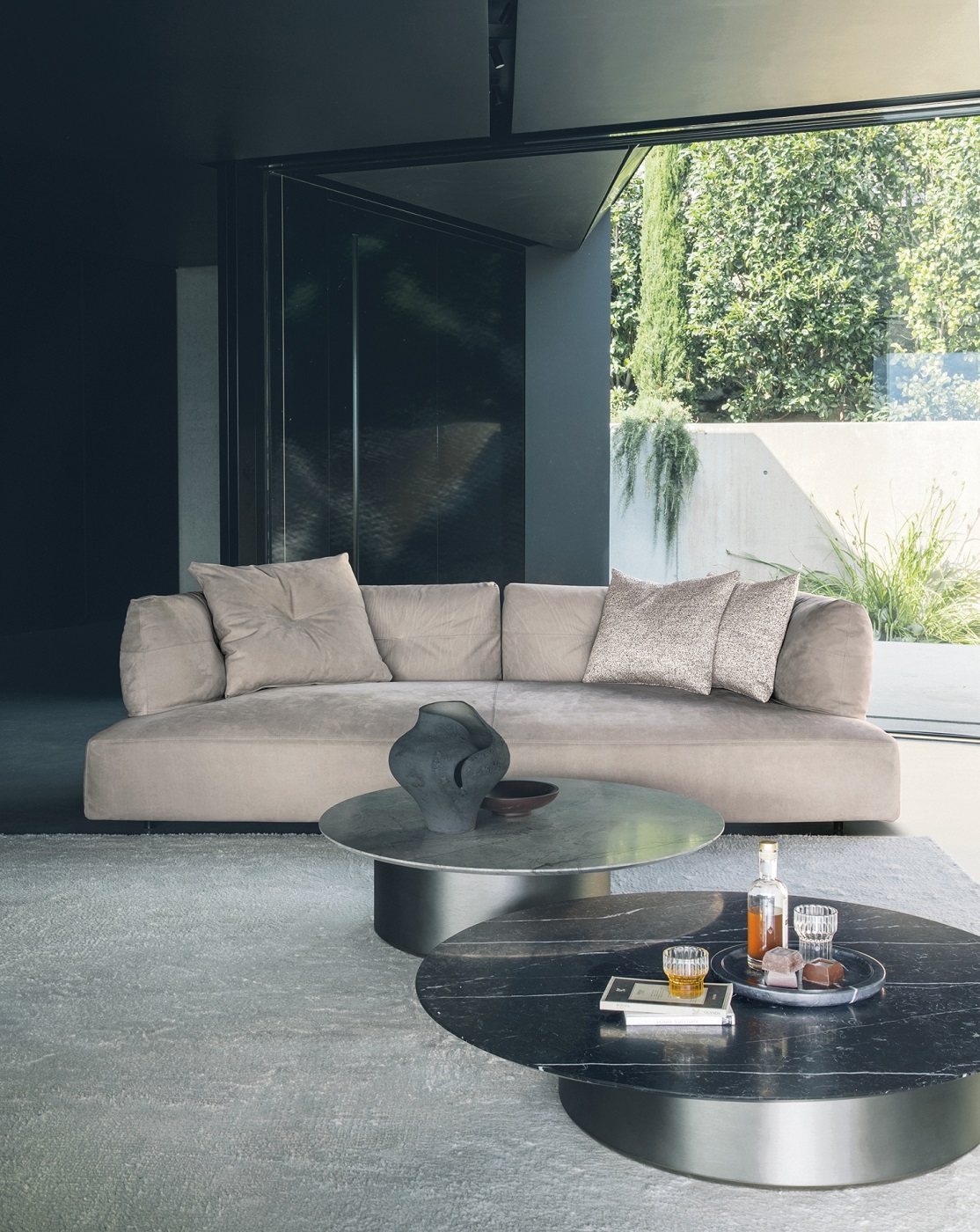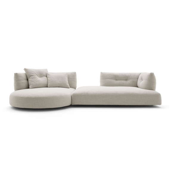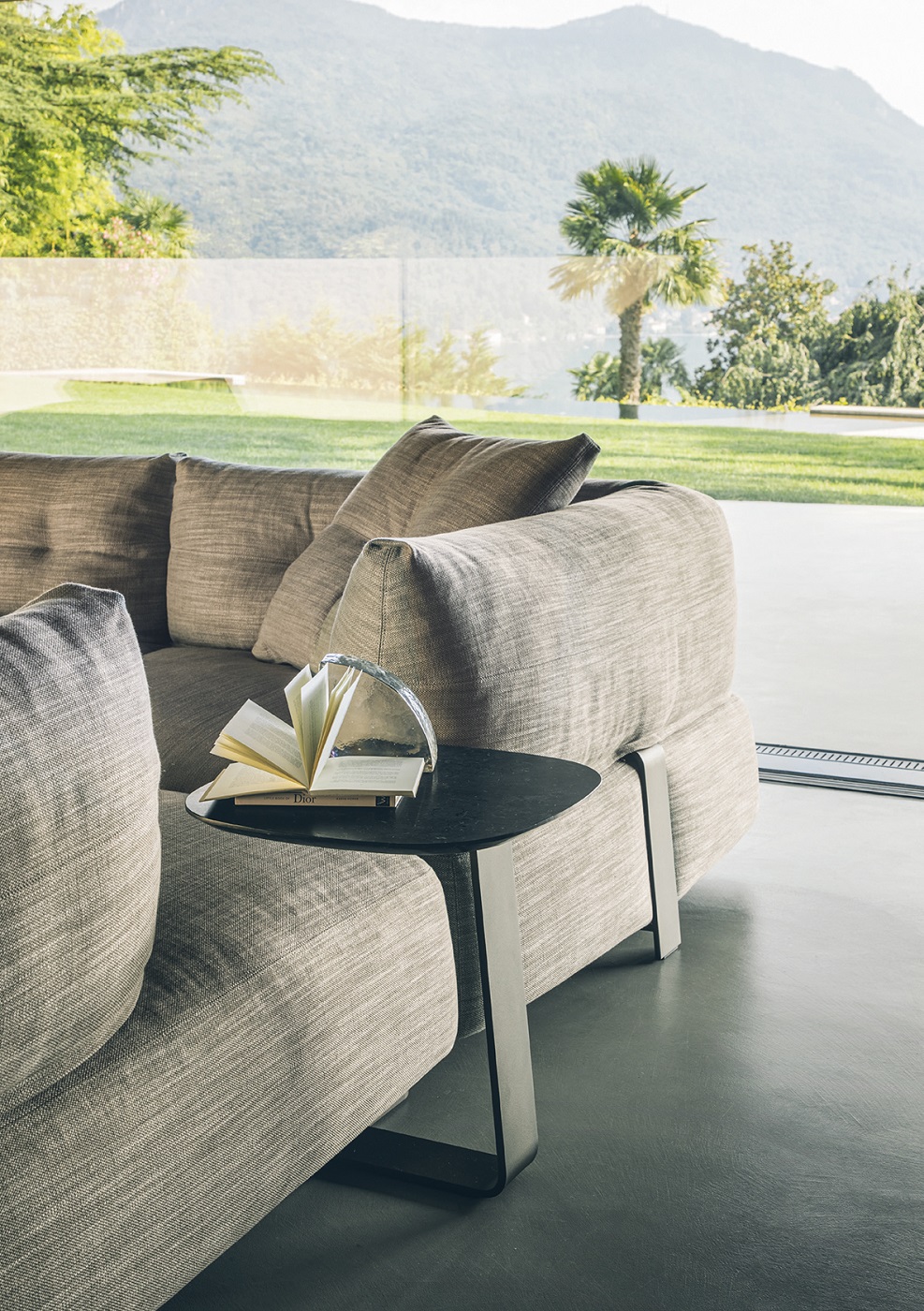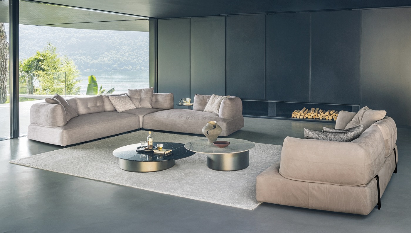 Модульный диван Ethìa, характеризующийся органичными, изогнутыми формами, состоит из слегка закругленных, мягких элементов разных размеров, которые можно комбинировать для создания различных композиций. Спинки с эффектом стеганой строчки прикреплены к мягкому основанию с помощью видимых металлических креплений с бронзовым покрытием.