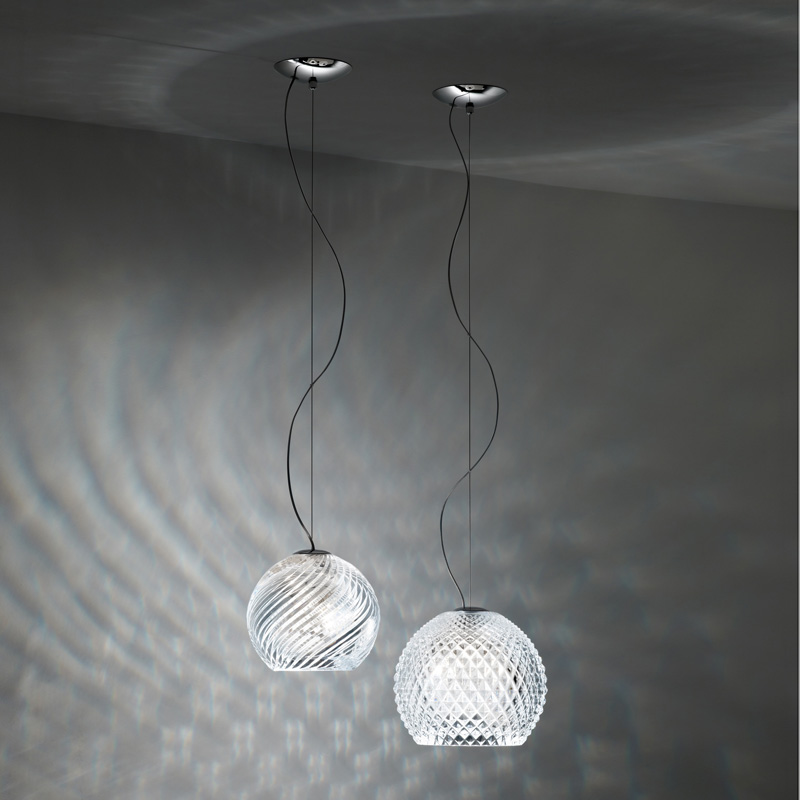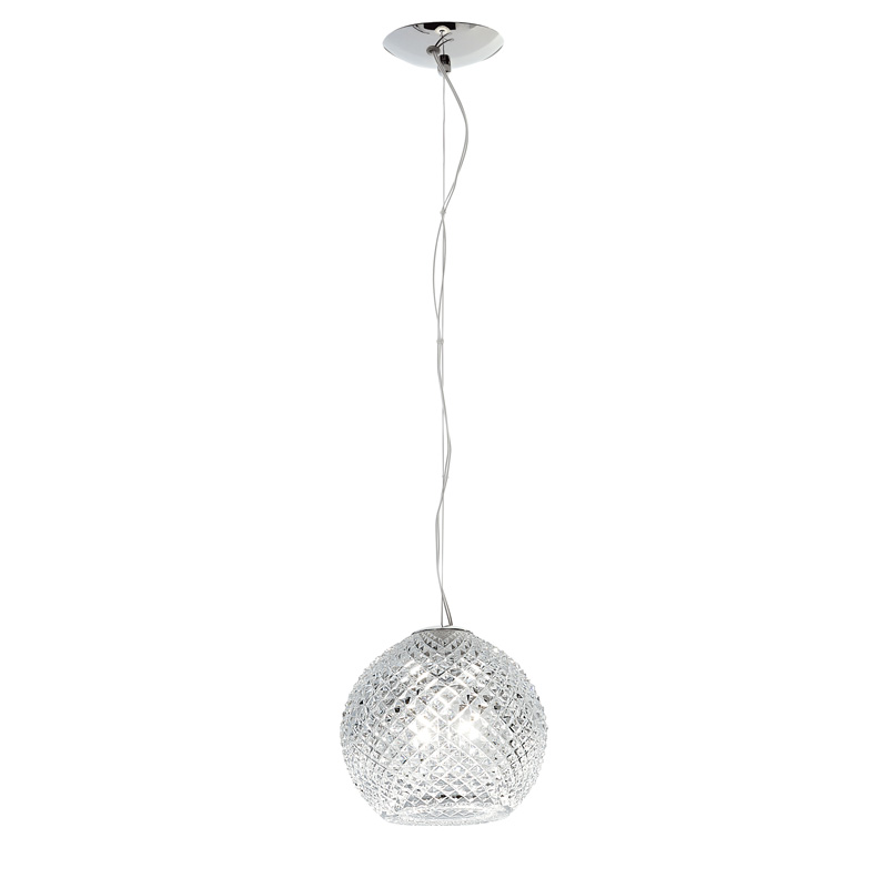 Потолочный светильник Fabbian Diamond&Swirl D82 A01 00 в стиле high-tech. Стеклянный шар-абажур. Арматура: блестящий хром. Высота светильника регулируемая: 30-190 см. Дизайн: Bridgewell Consulting LTD. Арт. D82A0100