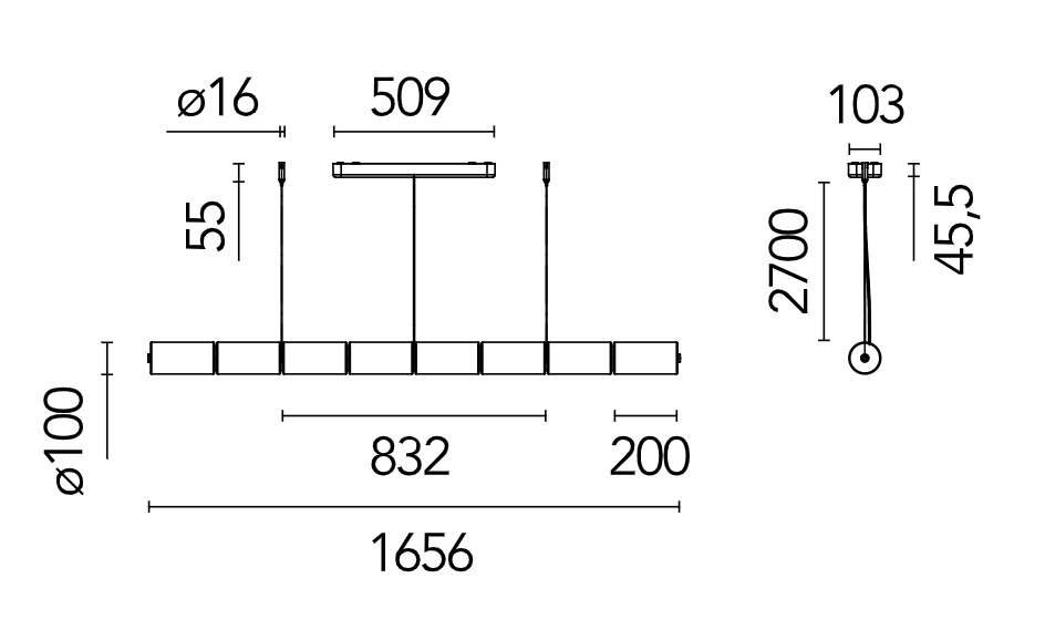 Под заказ доступны дополнительные размеры светильника (1,66 м. (S1) 2,07 м. (S2) 2,49 м. (S3))
