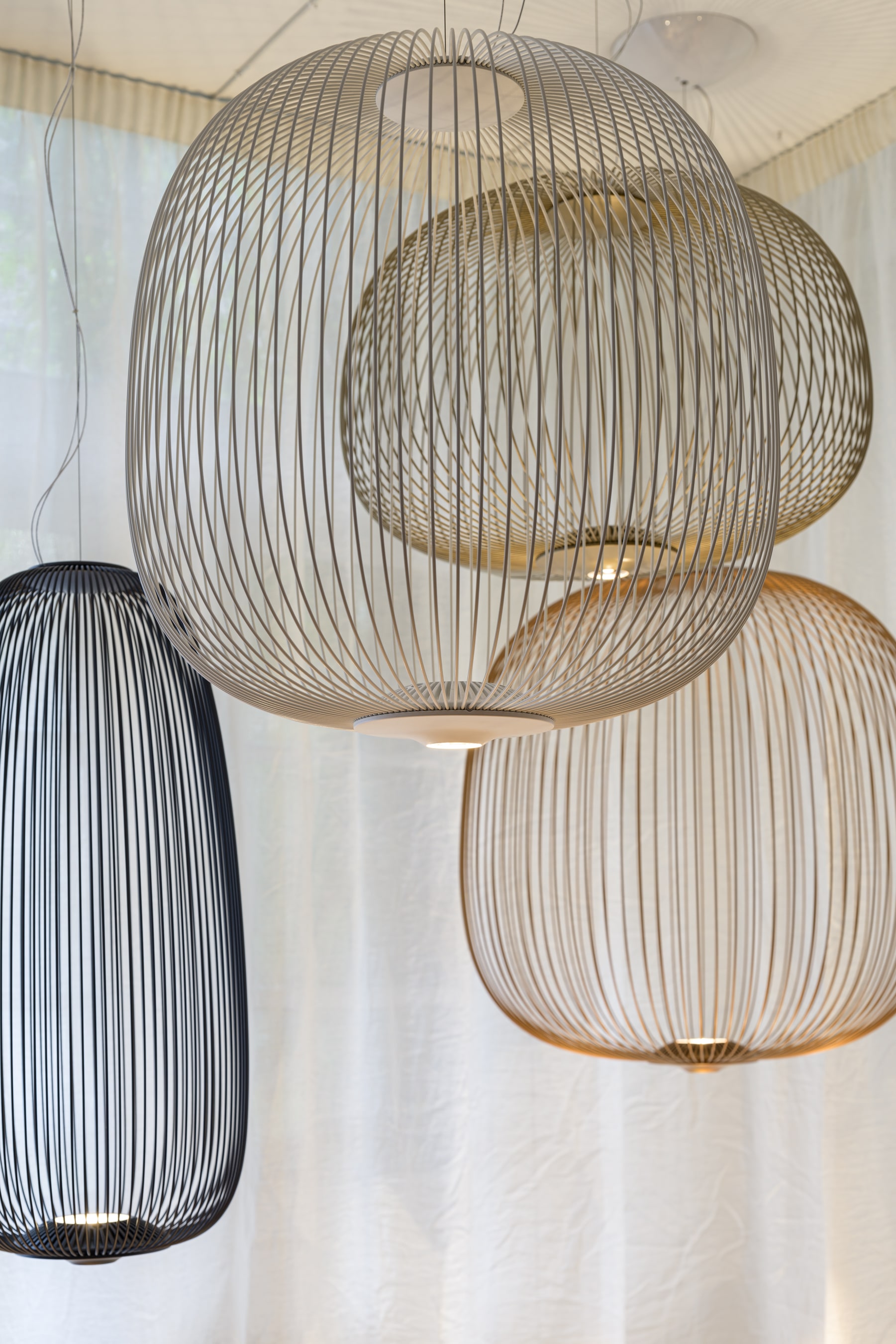 Подвесной светильник Foscarini Spokes 1 MyLight Gold. Подвесной светильник Spokes 1 отличается удлиненной и динамичной формой. Спицы из лакированной стали выражают ощущение легкого веса и движения. Словно пересекая магическую и геометрическую сетку, свет отфильтровывается изнутри, проецируя калейдоскоп из блоков и пустот. Регулировка яркости через Bluetooth с приложением Casambi. LED источник освещения в комплекте. Дизайн Garcia Gumini.