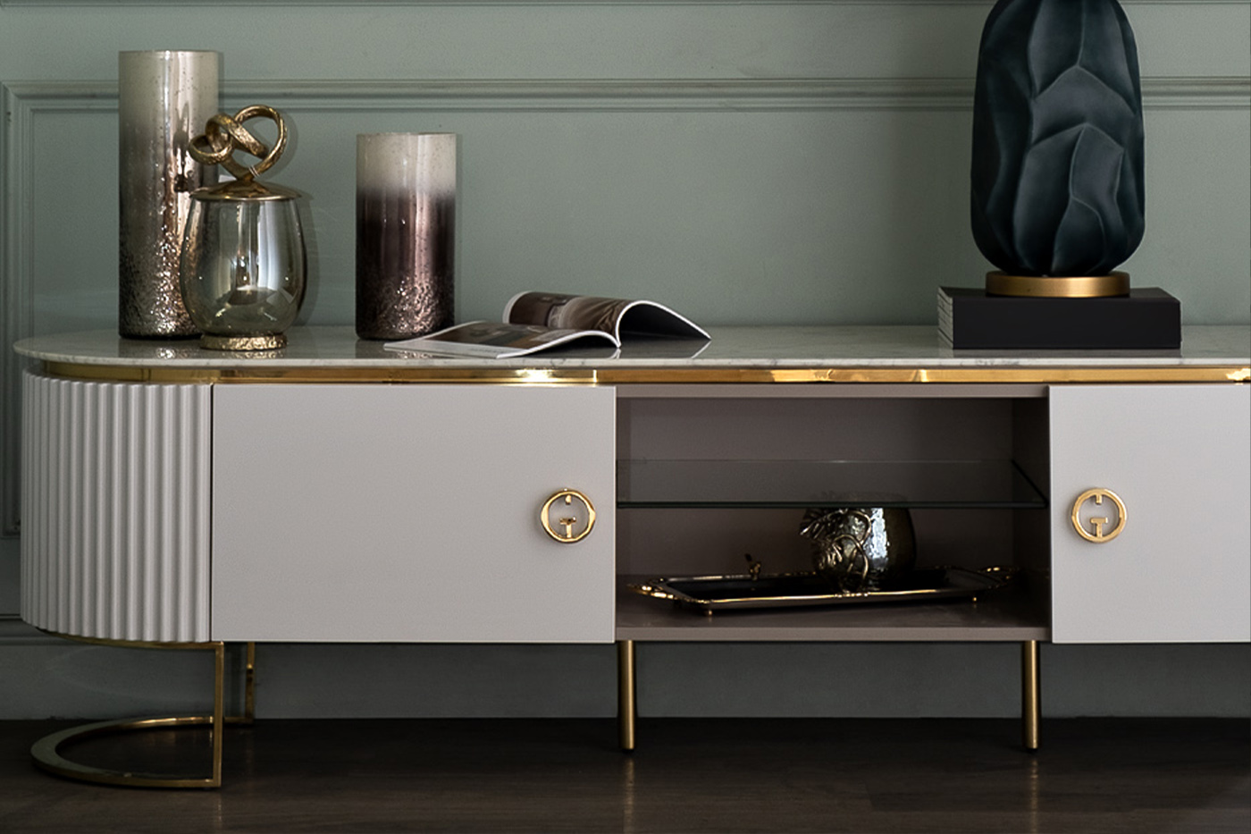 77IP-GD010-TV Тумба под TV LUCIANO 200*47*52см. Материал: МДФ, нерж сталь золото блестящий, столешница - мрамор+пленка ПВХ.