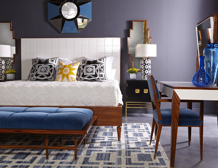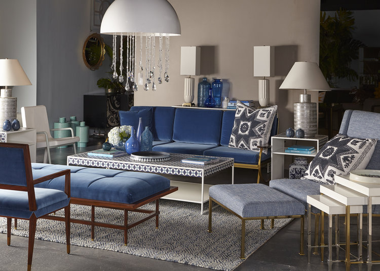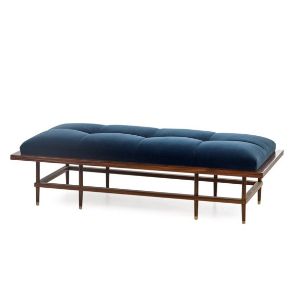 Банкетка Draper Bench с деревянным каркасом. сиденье оббито тканью синего цвета. Коллекция разработана известным американским дизайнером Трейси Бойд (Tracey Boyd).