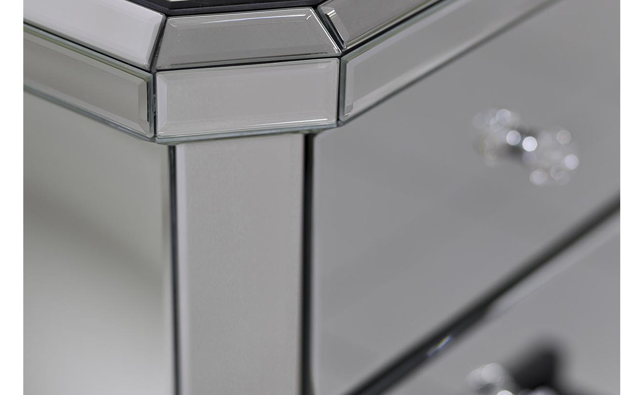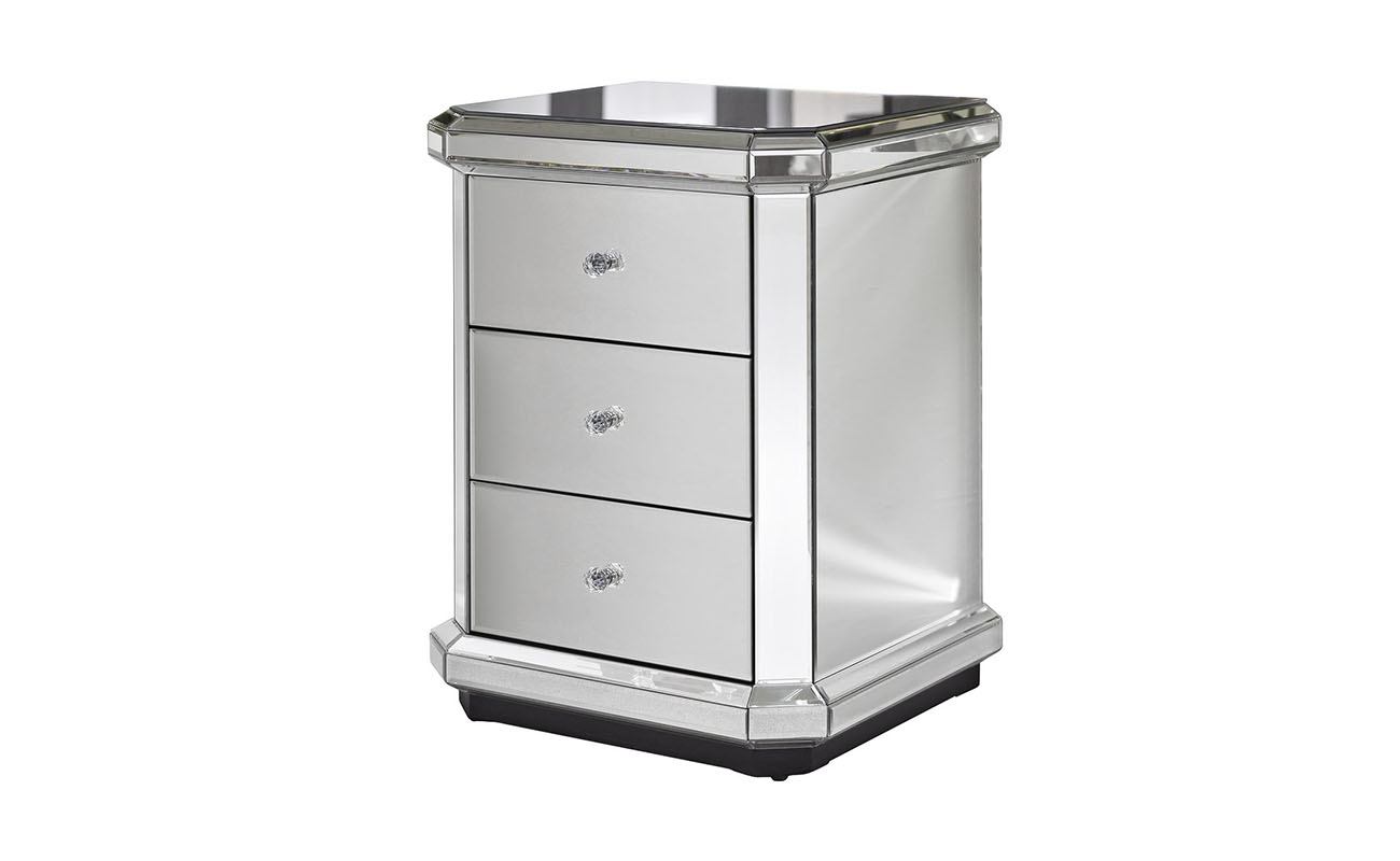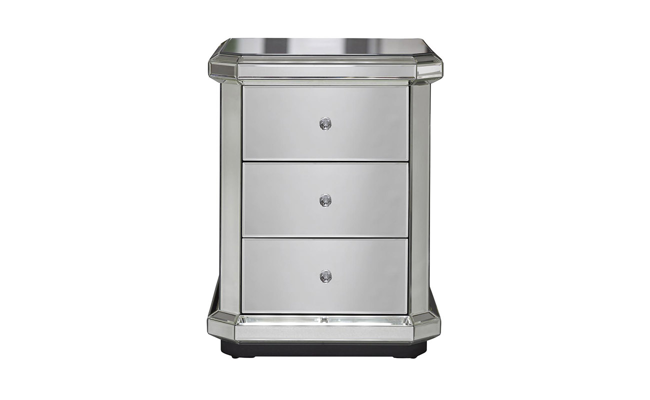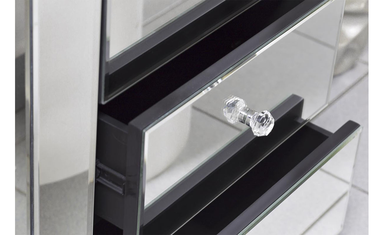 Тумба выполнена из дерева с отделкой зеркальным стеклом. Тумба оснащена тремя выдвижными ящиками. Фурнитура из стекла.