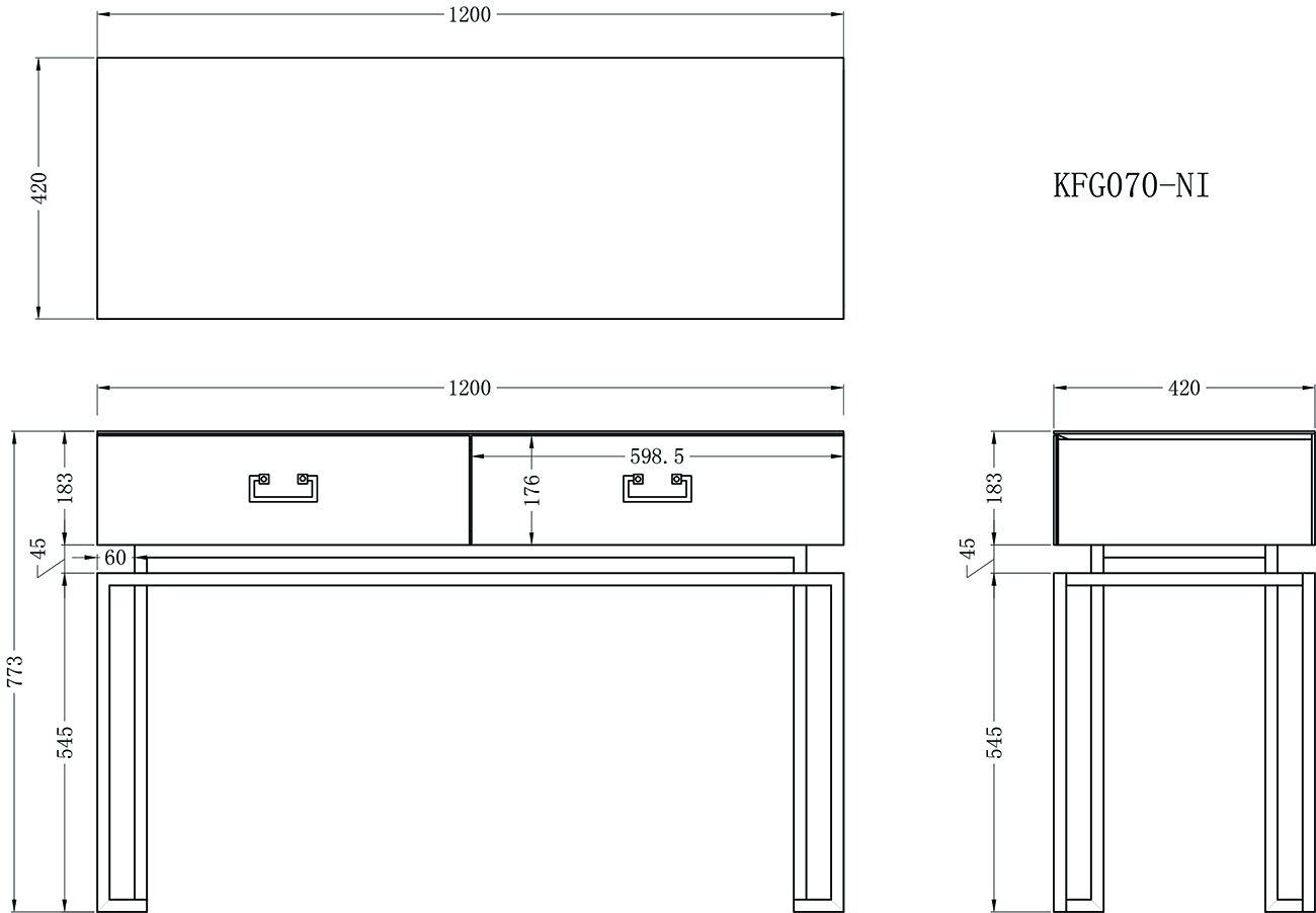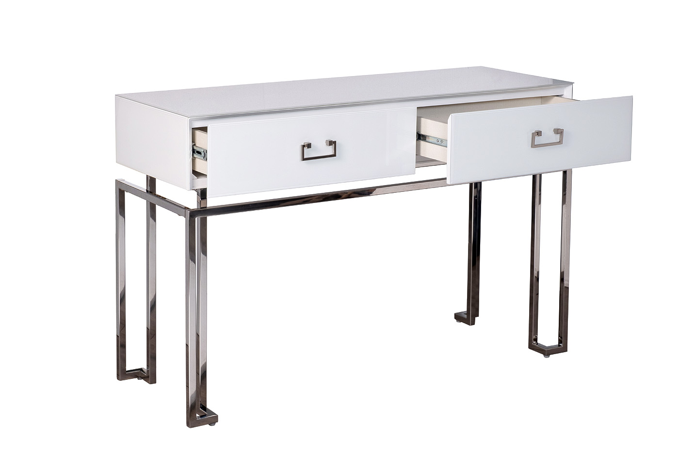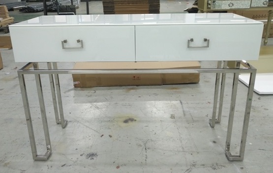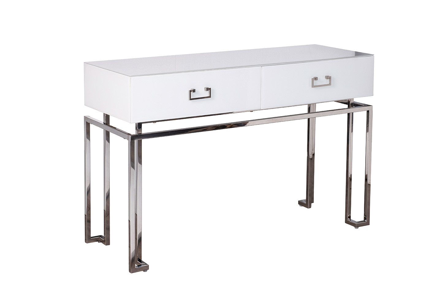 KFG070-NI Консоль 2 ящика белая/хром 120*42*77см. Материал: Стекло белое, МДФ, каркас - нерж. сталь цвет хром.