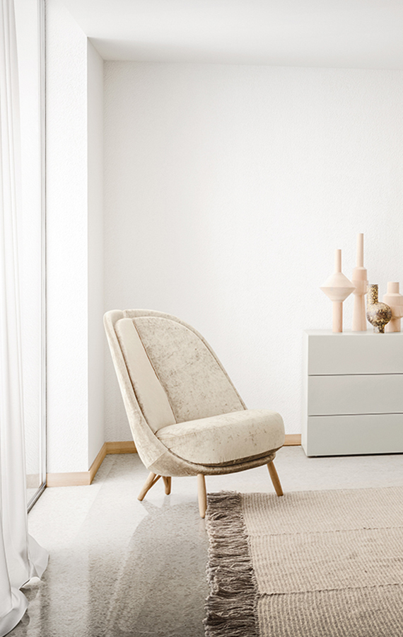 Кресло Pianca Calatea из ткани светло-бежевого цвета (Acacia color 01) и основанием из дерева с отделкой Frassino Lino. Под заказ возможно заказать различные варианты отделок и цветов.